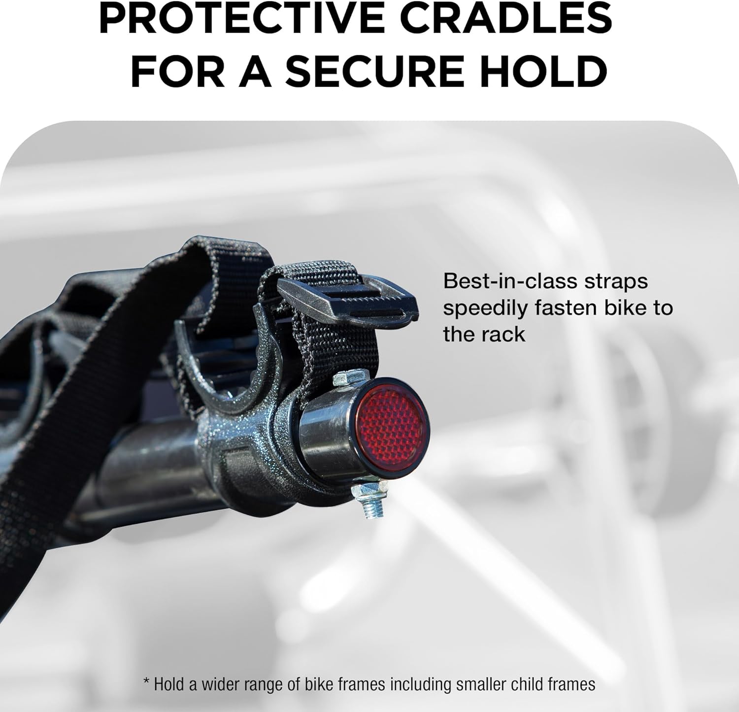 - NO-SCRATCH DESIGN: The rack is elaborately designed as a cradle to prevent direct contact between the rack's metal surface and your bike, avoiding any potential scratch or damage. With safety straps, soft padding and rubber covers, your bikes will be safely tightened onto the rack, facing the slightest wobbles even on the roughest roads.