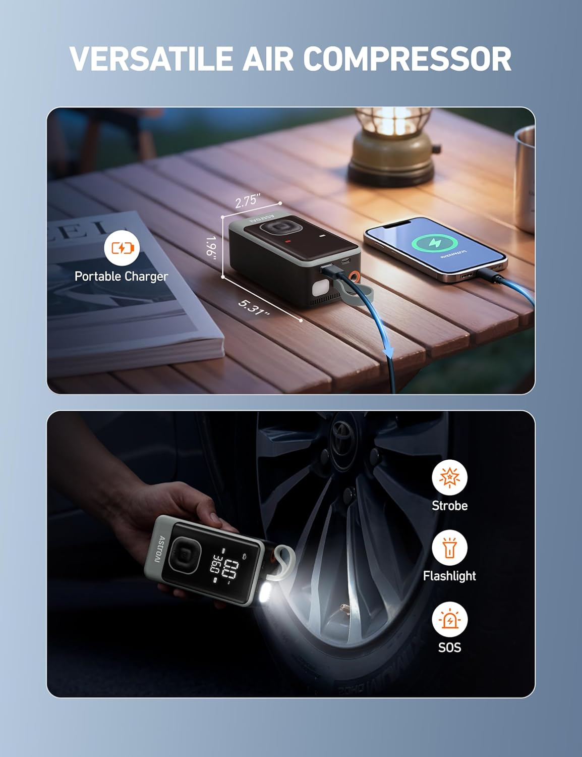 - LONG ENDURANCE, MORE INFLATION: Once fully charged, it can refill 8 car tires, or inflate 30 bike tires, 88 balls, or 18 motorcycle tires. Its intelligent battery management system monitors the power in real-time, making it perfect for long trips, outdoor activities, and daily commuting