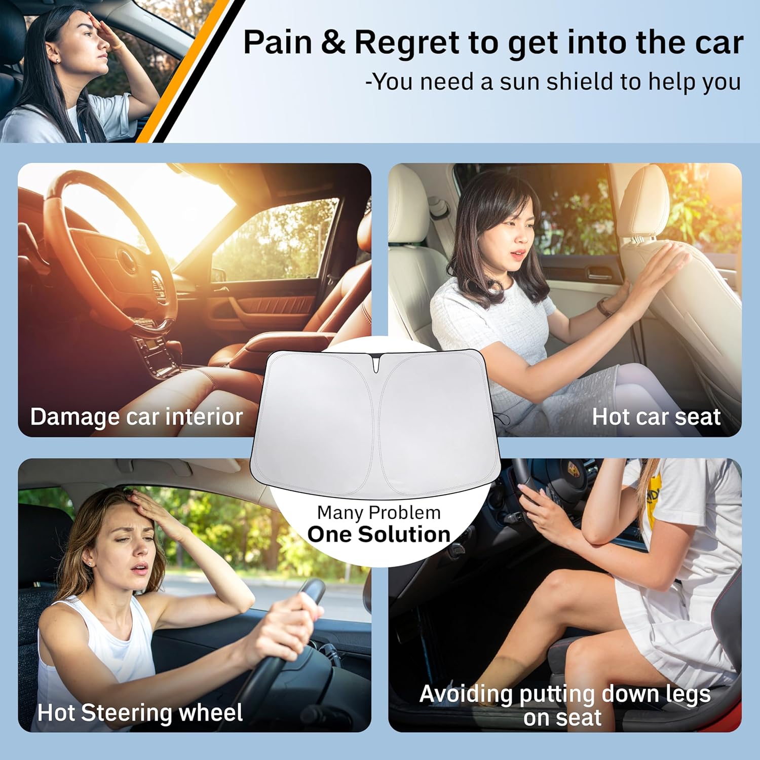 - Superior UV & Heat Protection – Made from high-quality 240T silver-coated polyester fabric, this sunshade effectively blocks harmful UV rays and reduces heat buildup. Protects your dashboard, seats, and electronic components from fading, cracking, or overheating—preserving both appearance and function.
