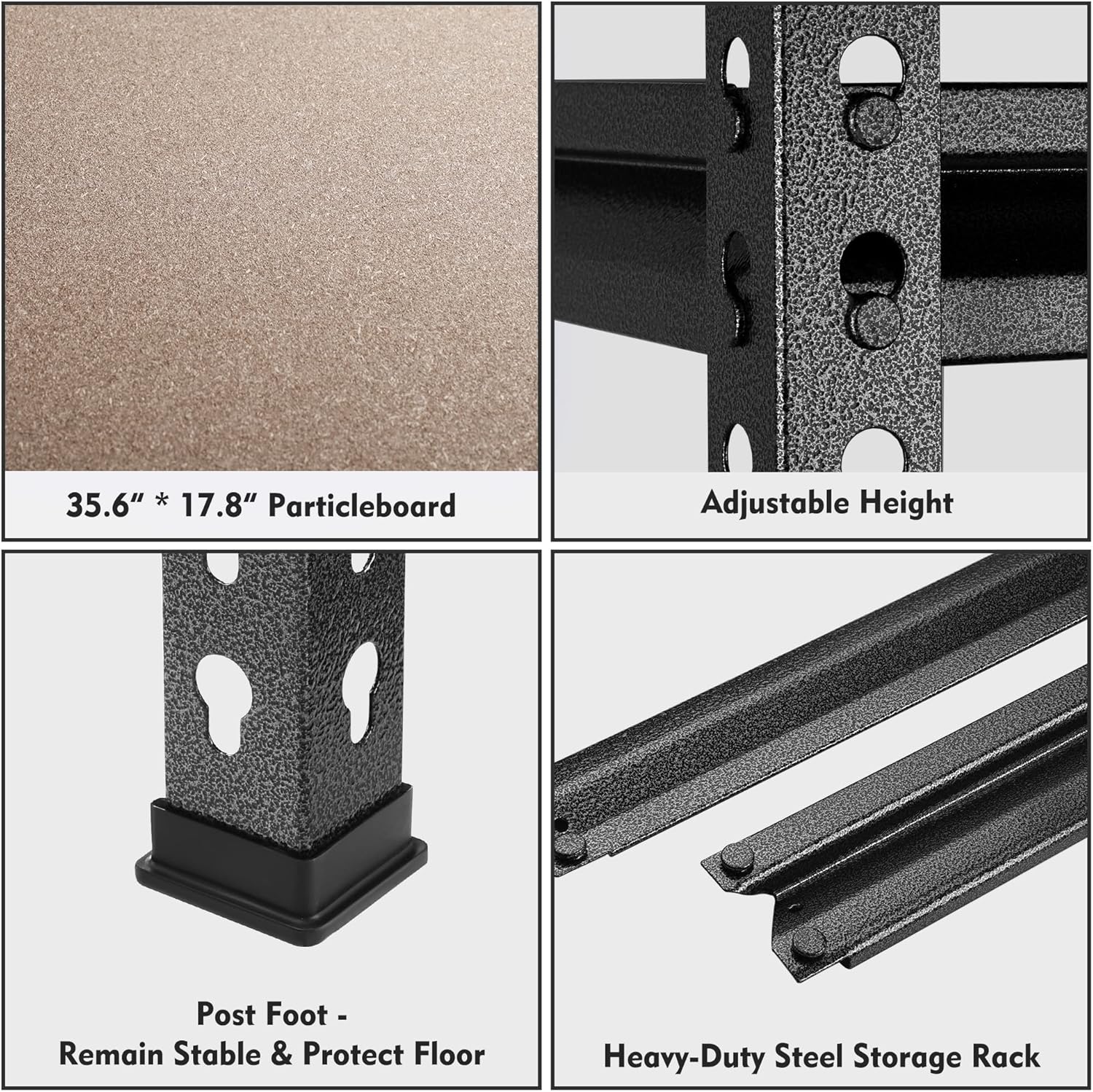 - 【Boltless Shelving】No nuts or bolts are required. You can assemble this shelving unit easily and quickly. A rubber mallet is recommended for assembly to tighten the shelving rack. It is also convenient when disassembled. This shelving is equipped with rubber footpads, which can protect the floor, add extra stability, and prevent the shelving from sliding accidentally.