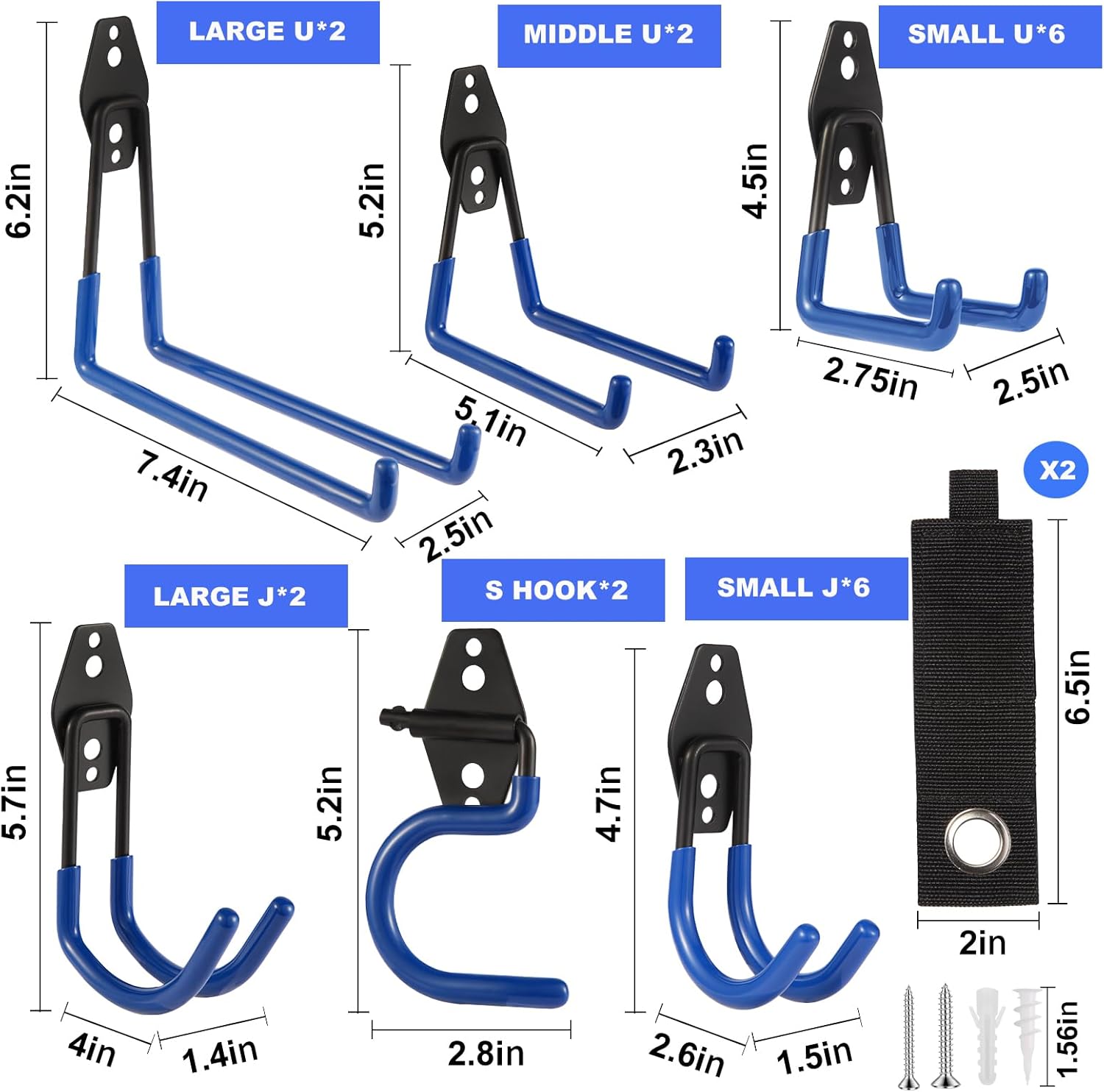 - ZexHok Wall Hook Assortment Set: 22 pack storage hooks organizer include with 6 sizes: 6pcs small J hooks, 6pcs small U hooks, 2pcs large J hooks, 2pcs middle U hooks, 2pcs large U hooks, 2pcs S hooks and 2pcs straps for hanging tools of different sizes and weight.