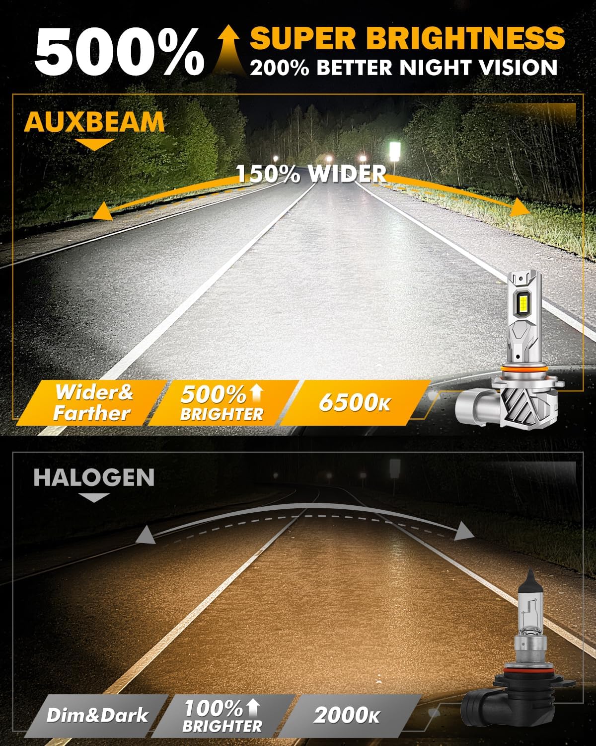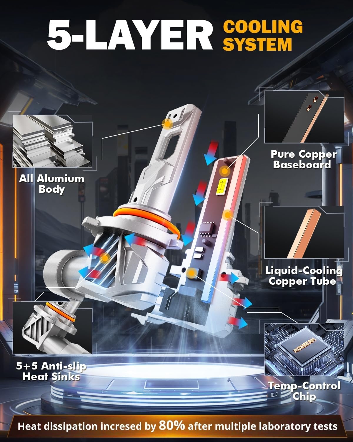 - 5-Layer Cooling System: Auxbeam 9005 9006 lights is designed with built-in liquid-cooling copper tube, customized temp-control chips, pure copper baseboard, 10PCs anti-slip heat sinks and all aluminum shell. Directly improves 80% heat dissipation and extends the service life to 60,000hrs