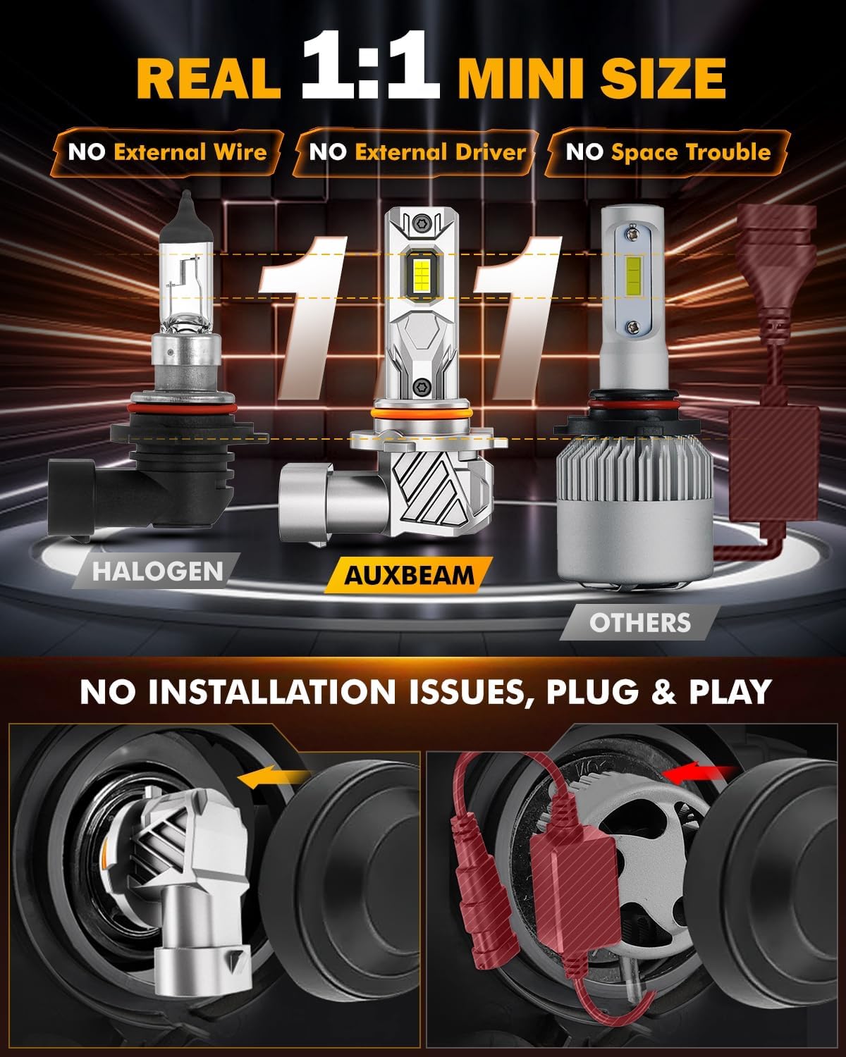 - Plug and Play without Fan: All-in-one metal design, 1:1 mini size, easy installation within 3 minutes. No bulky external driver box, no wiring pigtail, no plastic adapter or plugs.. Perfectly fitting into your housing and factory sockets without modification. The fanless design isolates dust and moisture, avoiding noise, fan issues and wea