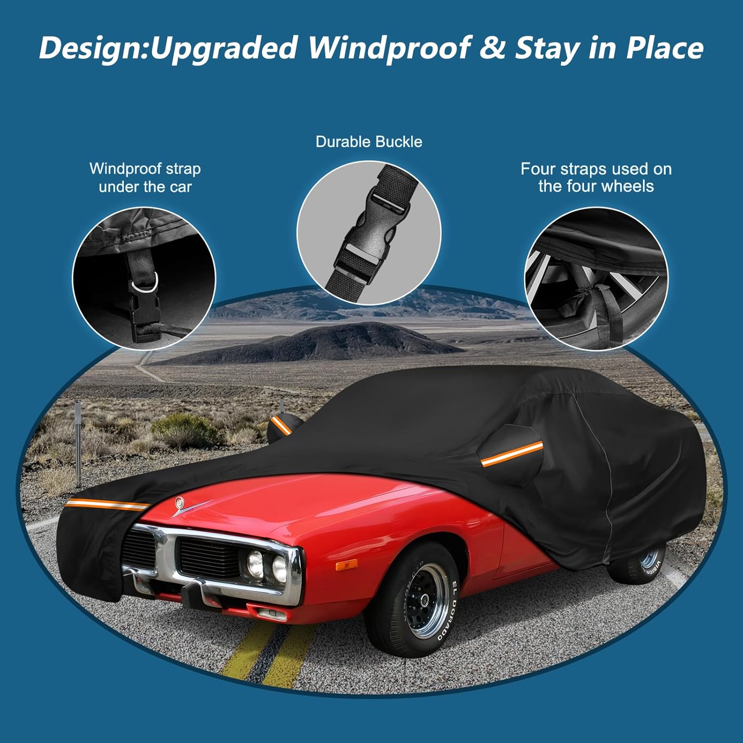 - 【Upgraded Windproof Design-Stay in Place】*1. Four straps are used on the four wheels to make sure the cover stays in place. *2. A windproof buckle passes through the middle of the car. *3. Elastic hem at the bottom of front and rear to ensure the cover fits your car and to protect your car cover from blowing off, even in heavy wind. *4. There are two extra-long straps for the hood and rear wind protection.