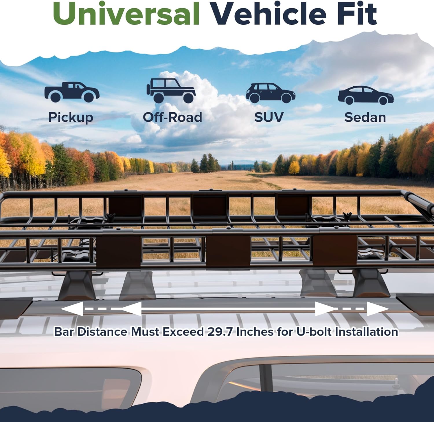 - Quick & Easy Installation: Universal U-bolts and three size adjustments make for fast, secure installation on most vehicles. No hassle, just robust and stable support for your cargo. During installation, please ensure that the bar distance is greater than 29.7 inches to allow for U-bolt installation.