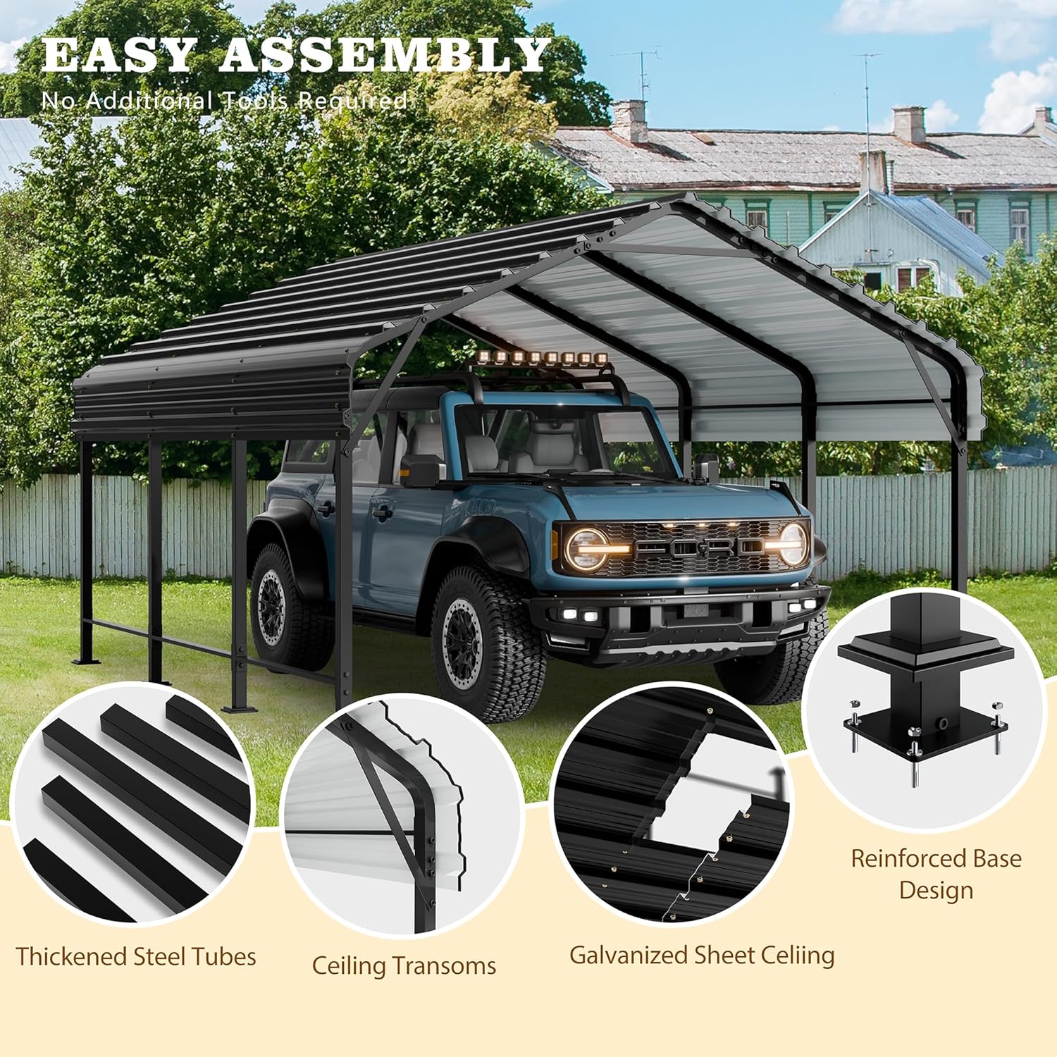 - 【Heavy-Duty Carport】This Carport canopy is made with a rust-resistant powder-coated steel frame to prevent rust and corrosion. Its high-quality galvanized steel roof provides excellent anti-rust and sun protection, ensuring reliable protection for your belongings.