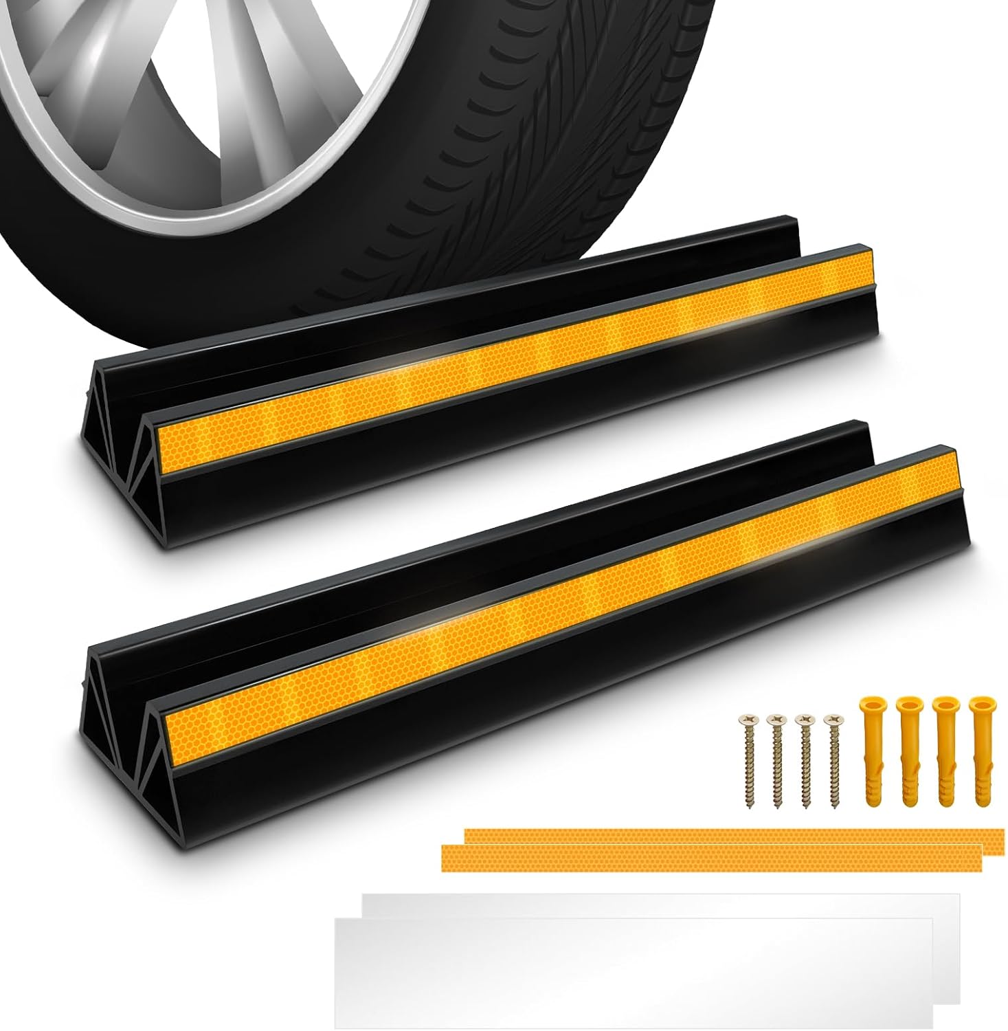 2 Pcs 18'' Parking Car Wheel Stopper for Garage with 2 Installation Methods, Heavy Duty Tire Stops with Reflective Tapes, Car Parking Aids for Garage, Easy to Install