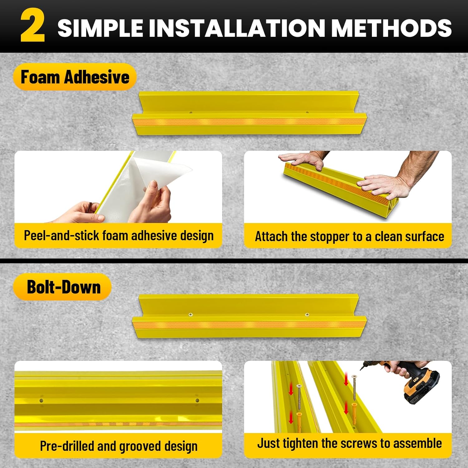 - Easy Installation: The garage car stopper features a peel-and-stick foam adhesive design for quick and effortless installation. The pre-drilled holes allow for the utilization of the included screws to ensure the stopper stays in place when subjected to tire impacts