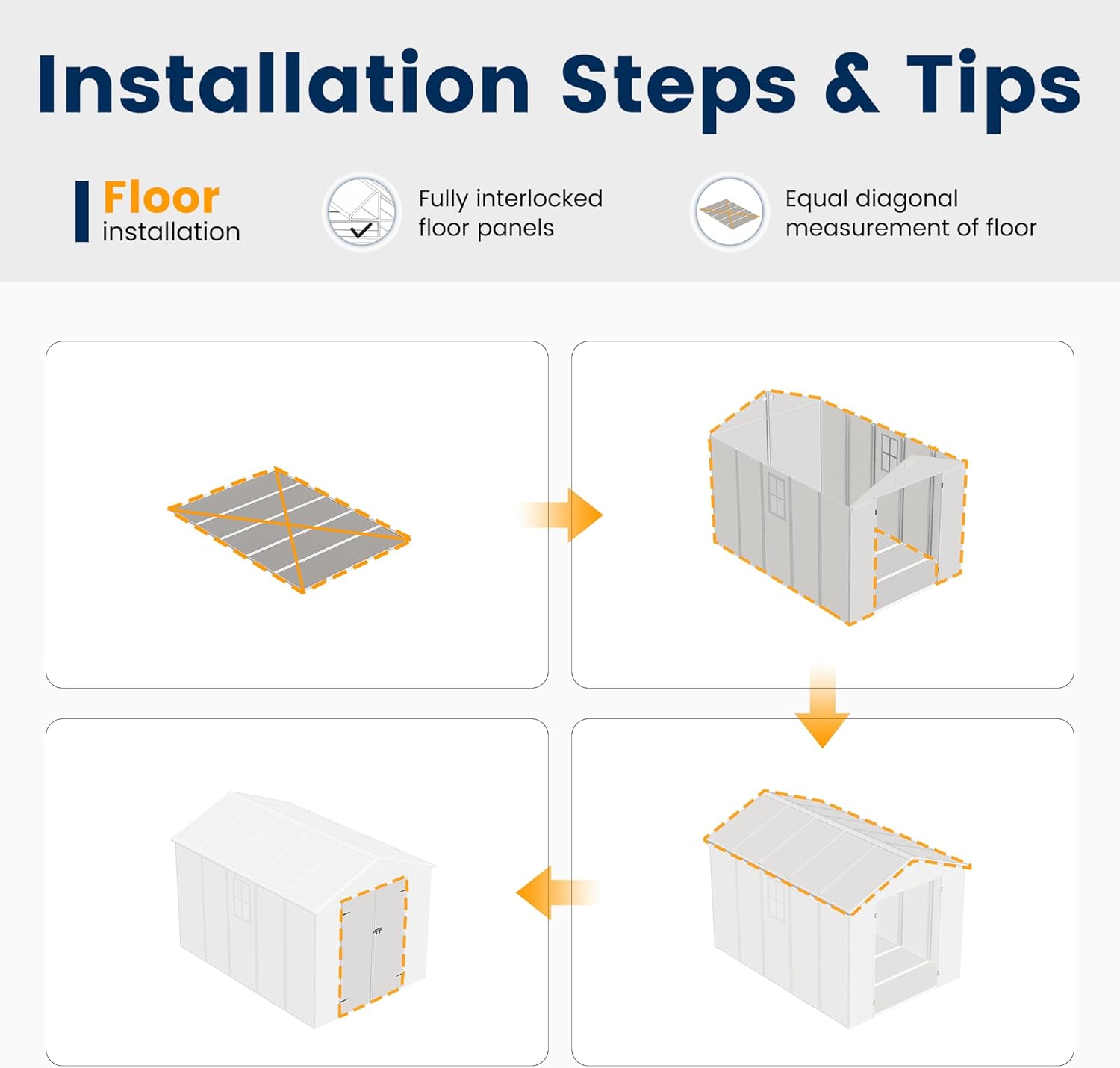 - Please note: The 8x10 dimensions are measured based on the exterior length and width of the eaves, not the interior floor measurements.