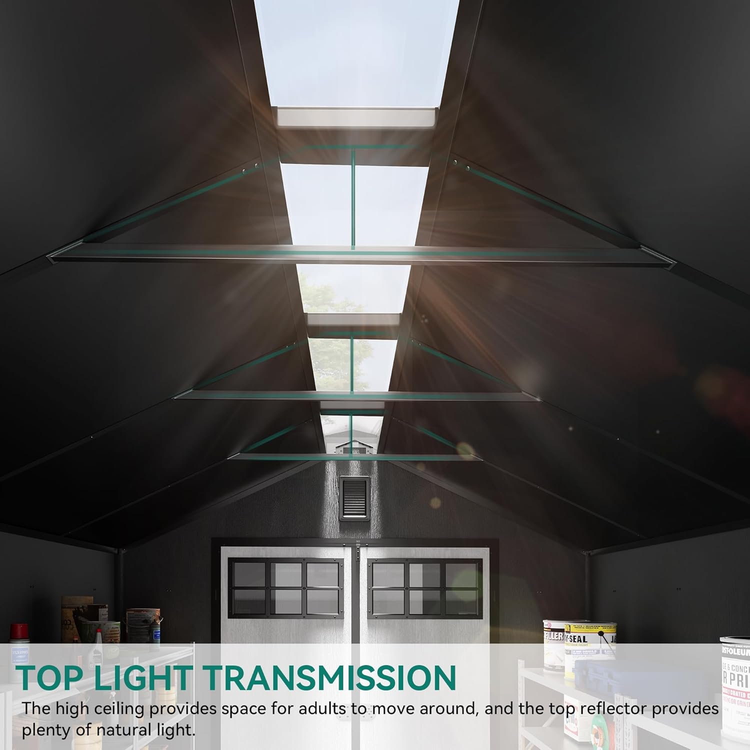 - Enhanced Security and Natural Light: The plastic storage shed includes lockable double doors with transparent windows for security and style; The translucent roof panel allows natural light in, illuminating the interior and making it easier to find items
