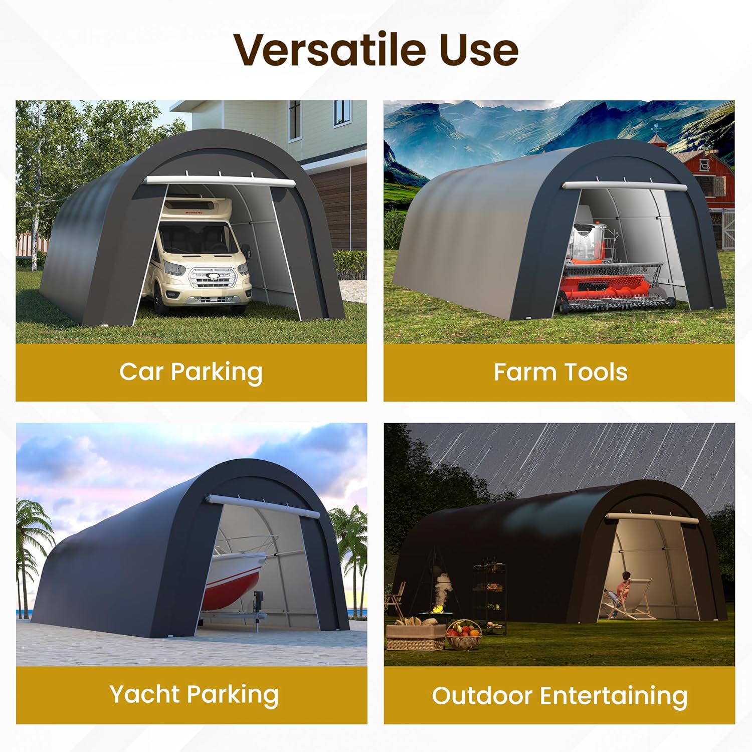 - DOMED CARPORT: 12x25 ft car port dome design prevents water and snow buildup, reducing structural stress and enhancing durability. The sleek, curved shape of the carport is more attractive and provides more interior space and better air circulation