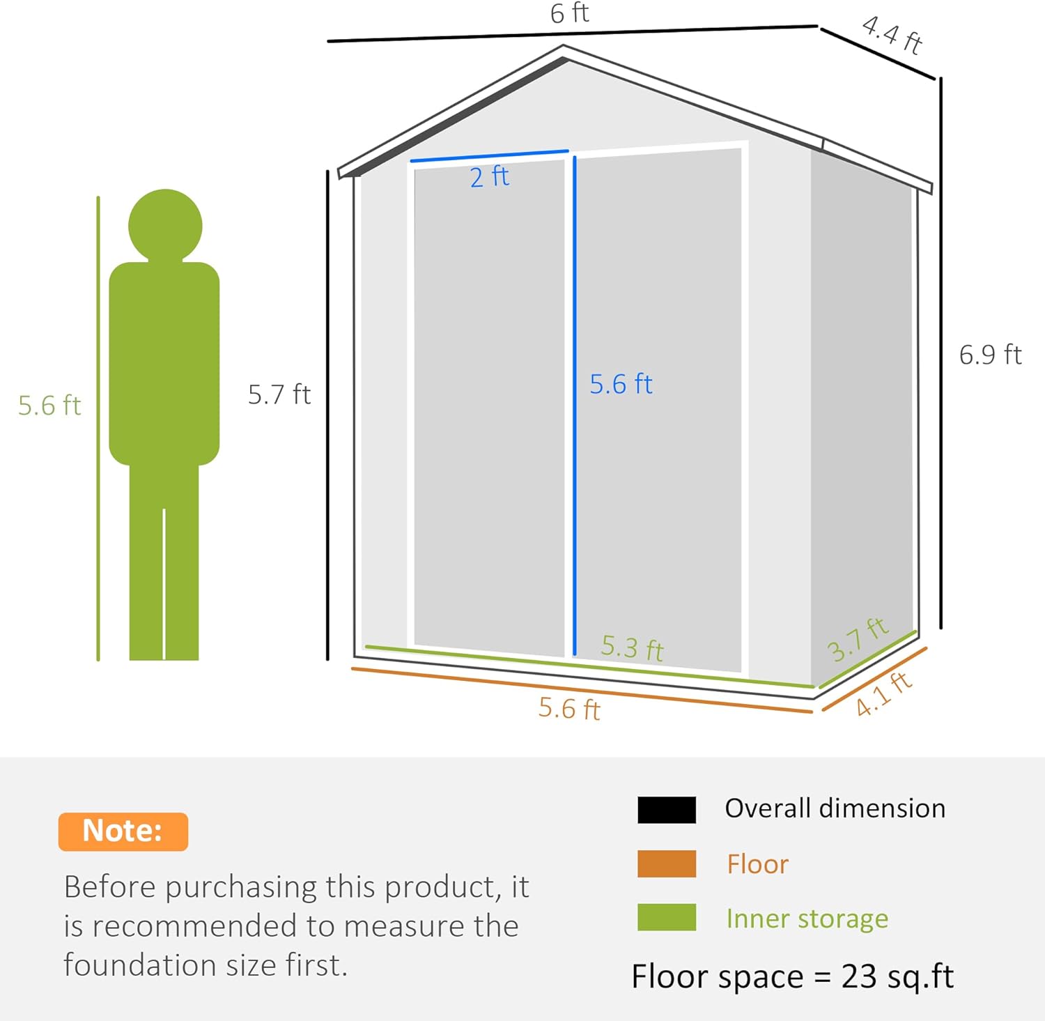 - Outdoor Shed House Details: The shed's external dimensions are 72" W x 52.75" D x 82.75" H, with an internal size of 64.25" W x 45" D. Installation gloves are included for your safety during assembly. We recommend that 2-3 people install it together.