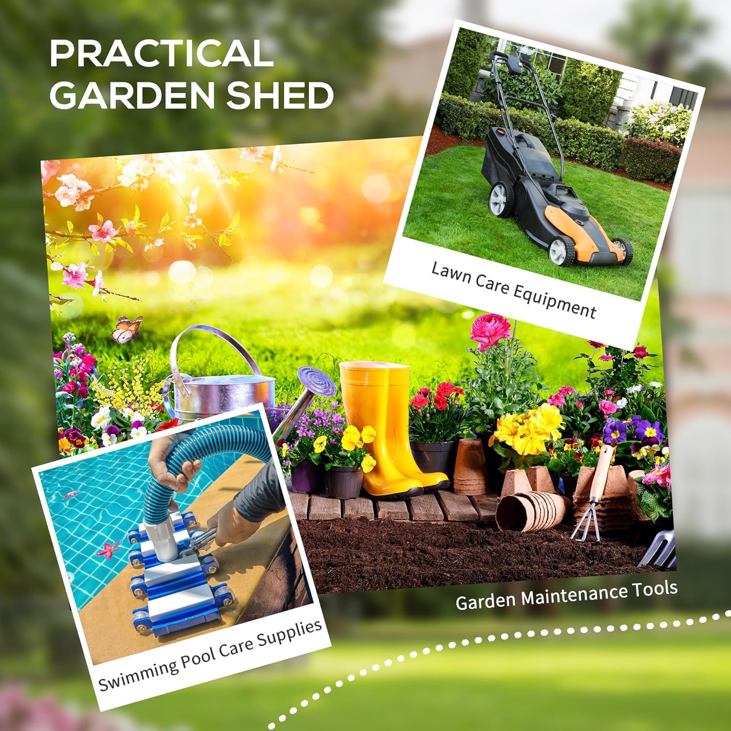 - Spacious Outdoor Shed: Our versatile garden tool shed, great for storing everything from garden tools and lawn care equipment to pool supplies. Its ample space can accommodate bicycles and long-handled tools such as rakes and shovels.