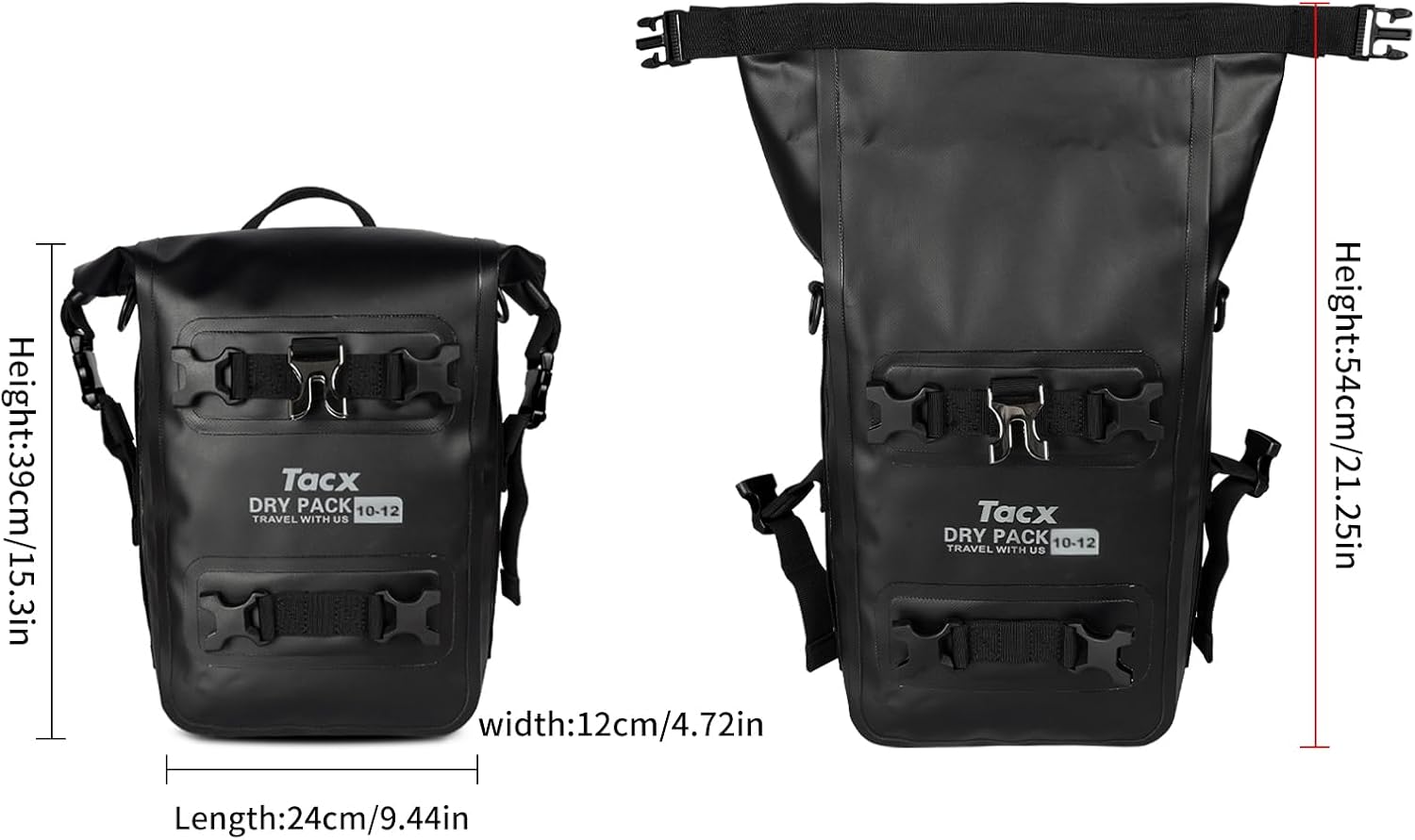 - Capacity and Size: The maximum capacity of this motorcycle side bag is 12L. If you want to reduce the capacity, you can roll the bag lid down 2-3 times to reduce the volume. Folding size: L * W * H: 9.44 * 4.72 * 15.3 inches