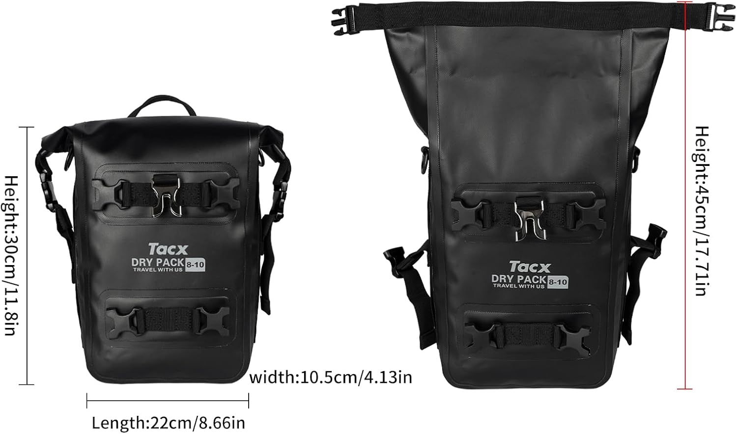 - Capacity and Size: The maximum capacity of this motorcycle side bag is 10L. If you want to reduce the capacity, you can roll the bag lid down 2-3 times to reduce the volume. Folding size: L * W * H: 8.66 * 4.13 * 11.8 inches