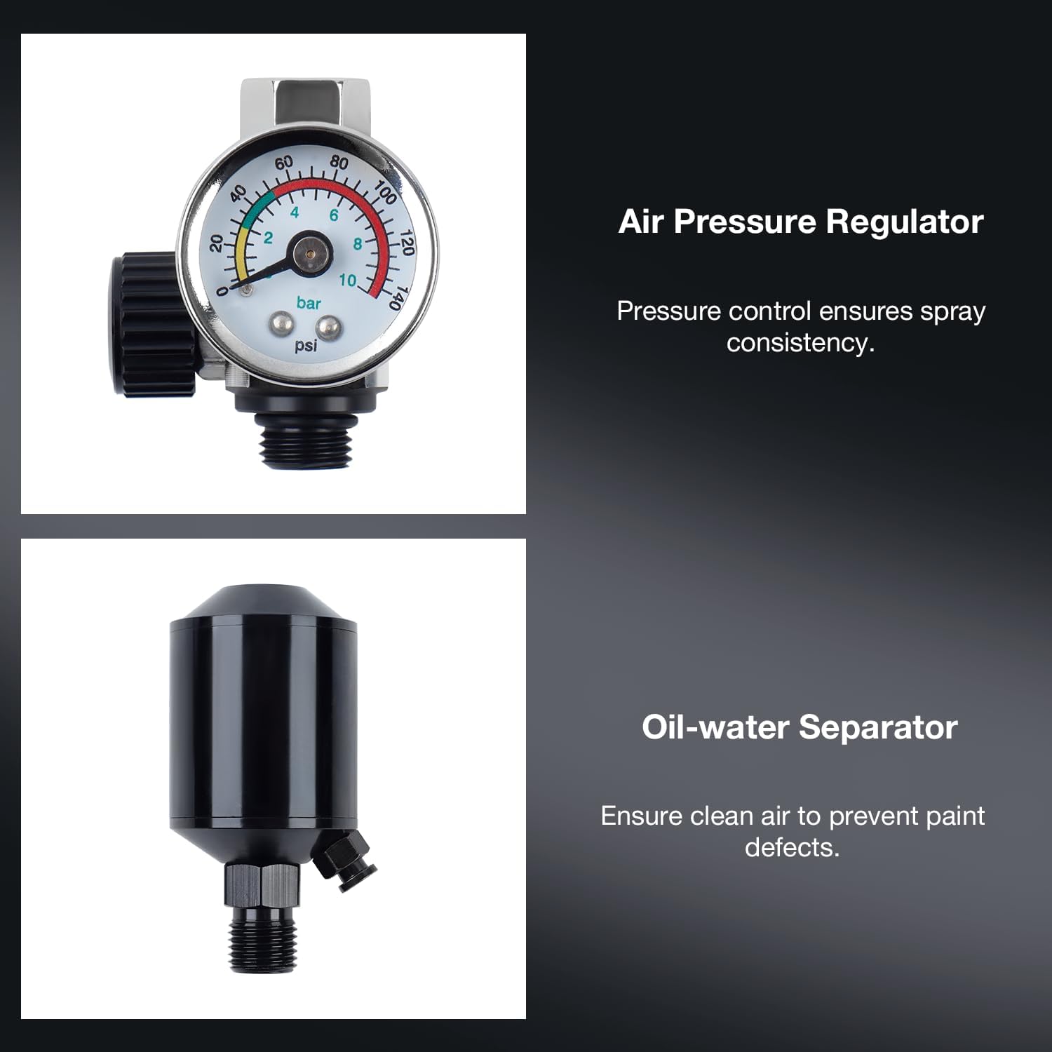 - Complete Kit & Lifetime Warranty: Includes HVLP auto paint gun, 3 nozzles (1.4/1.7/2.0mm), air pressure regulator, oil-water separator, 10 disposable paint cups with lids, 1 hard cups, 5 plugs, paint cup adaptor, 600cc cup, cleaning kit, PTFE tape, 10 flters cone and wrench so you’re ready to paint out of the box. Backed by a lifetime warranty for long-term reliability.