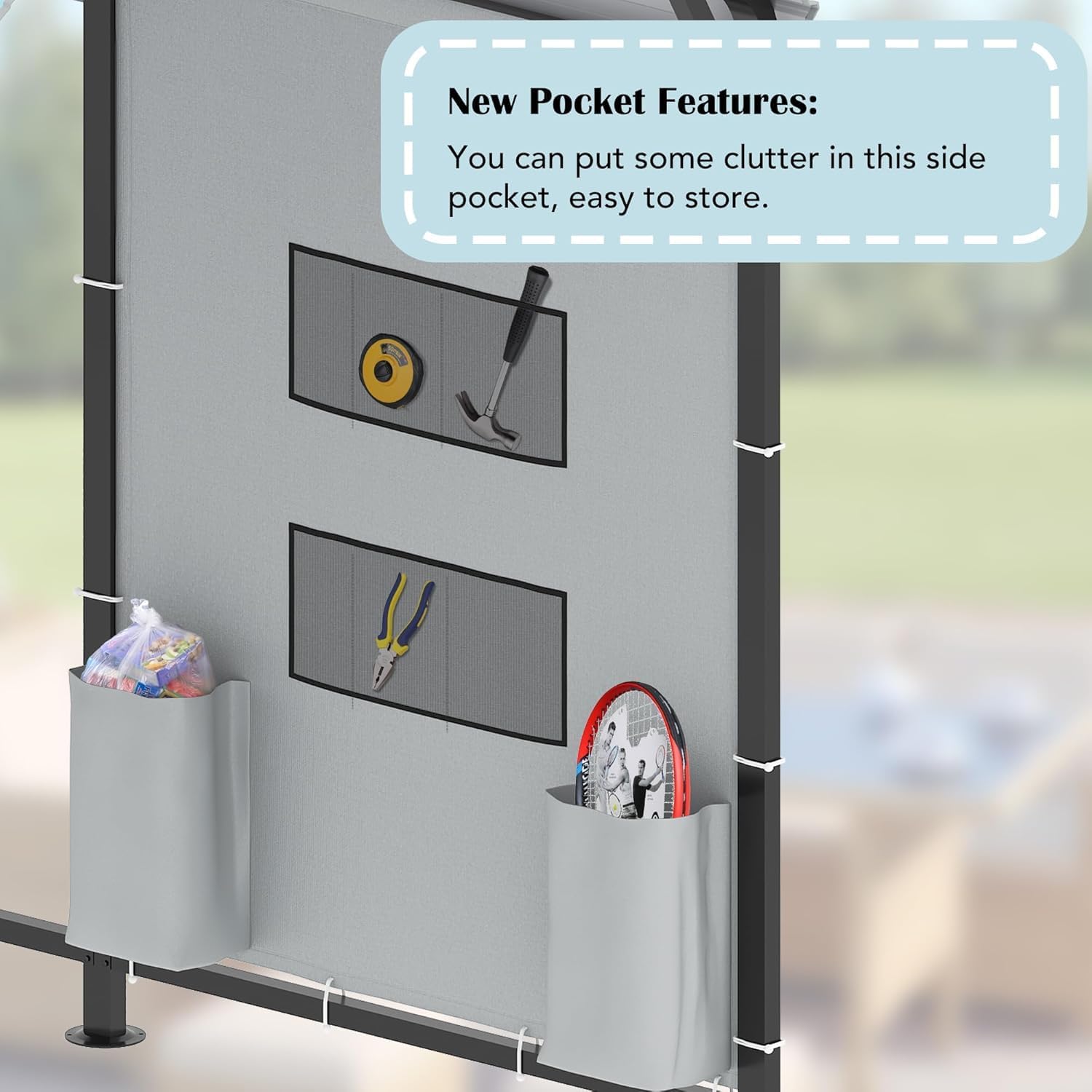 - Convenient Storage Pocket: Keep your tools handy with the included 2 PVC fabric side pocket. Easily attachable to any side of the metal carport frame with elastic buckles, it provides convenient extra storage right where you need it