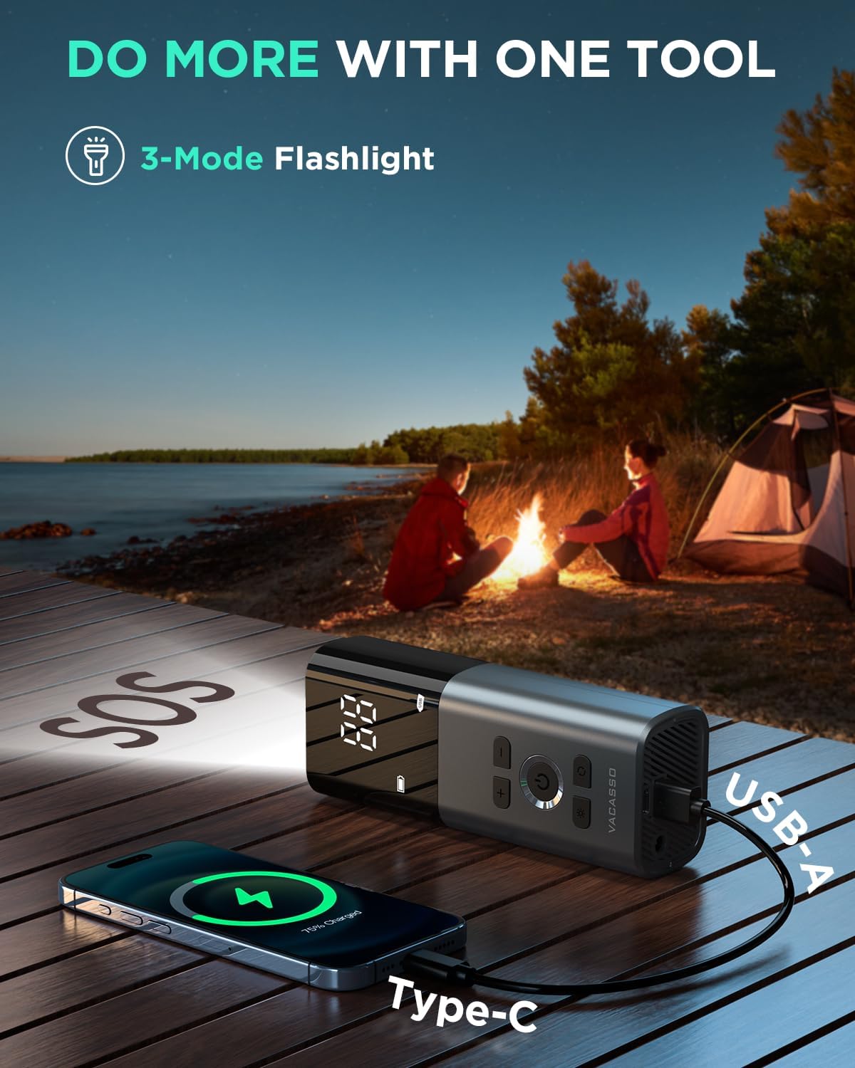 - PERFECT FOR EMERGENCIES: With its built-in 3-mode flashlight, this car tire inflator is perfect to keep in your car for nighttime tire inflation, roadside emergencies, or mobile device charging during power outages(1× USB-A to USB-C charging cable is included)