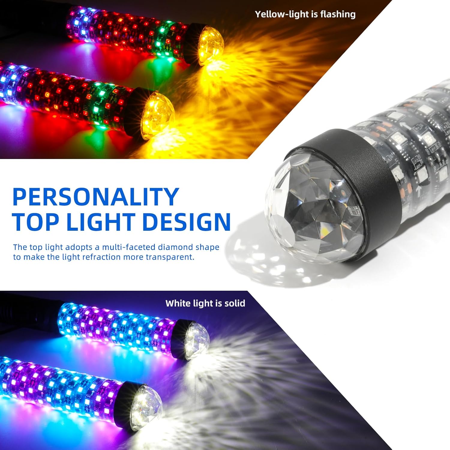 - 【Strobe Light Function】DREAMIZER new upgraded fat whip light is equippped with strobe light,which will emit high brightness white light and yellow light,combining with a bright RGBW whip light,adding more cool for your riding,and providing exceptional visibility during nighttime rides, foggy weather, or low-light environments, keeping you and your vehicle noticeable.