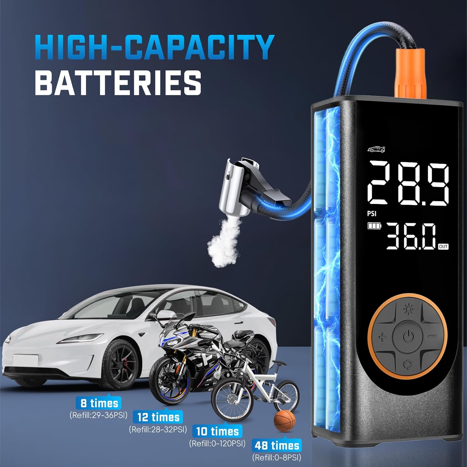 - 🛞 4X Fast Inflation & 5 Modes: This tire inflator portable air compressor delivers a maximum 150 PSI & 35 L/min airflow, inflating a car tire (29-36 PSI) in under 1 min. Features 4 preset modes: car, motorcycle, bike, and ball.