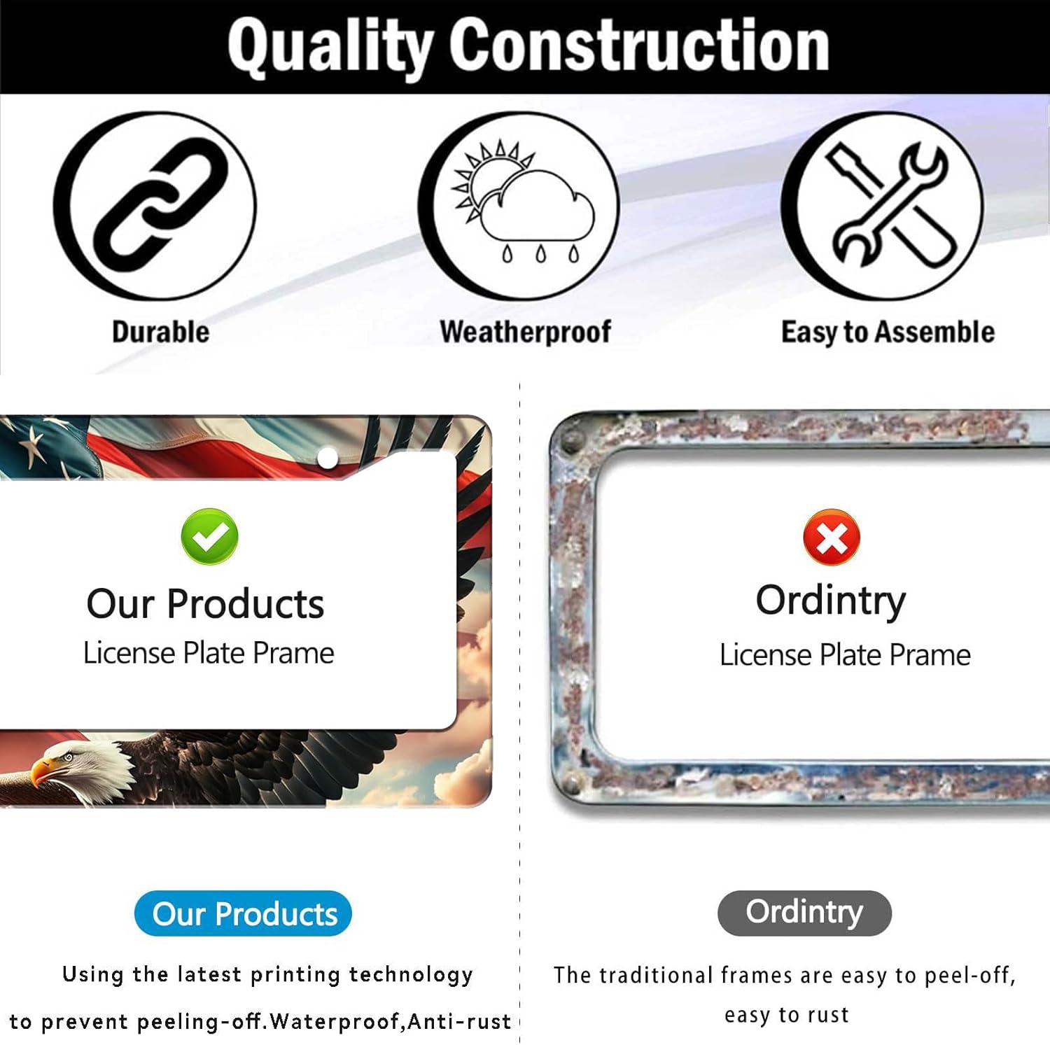 - PACKAGE CONTENTS: Set of 2 US Flag Eagle license plate frames and mounting accessories, designed specifically for drivers who want to add style to their vehicles.Little change on the plate, big joy on the road!