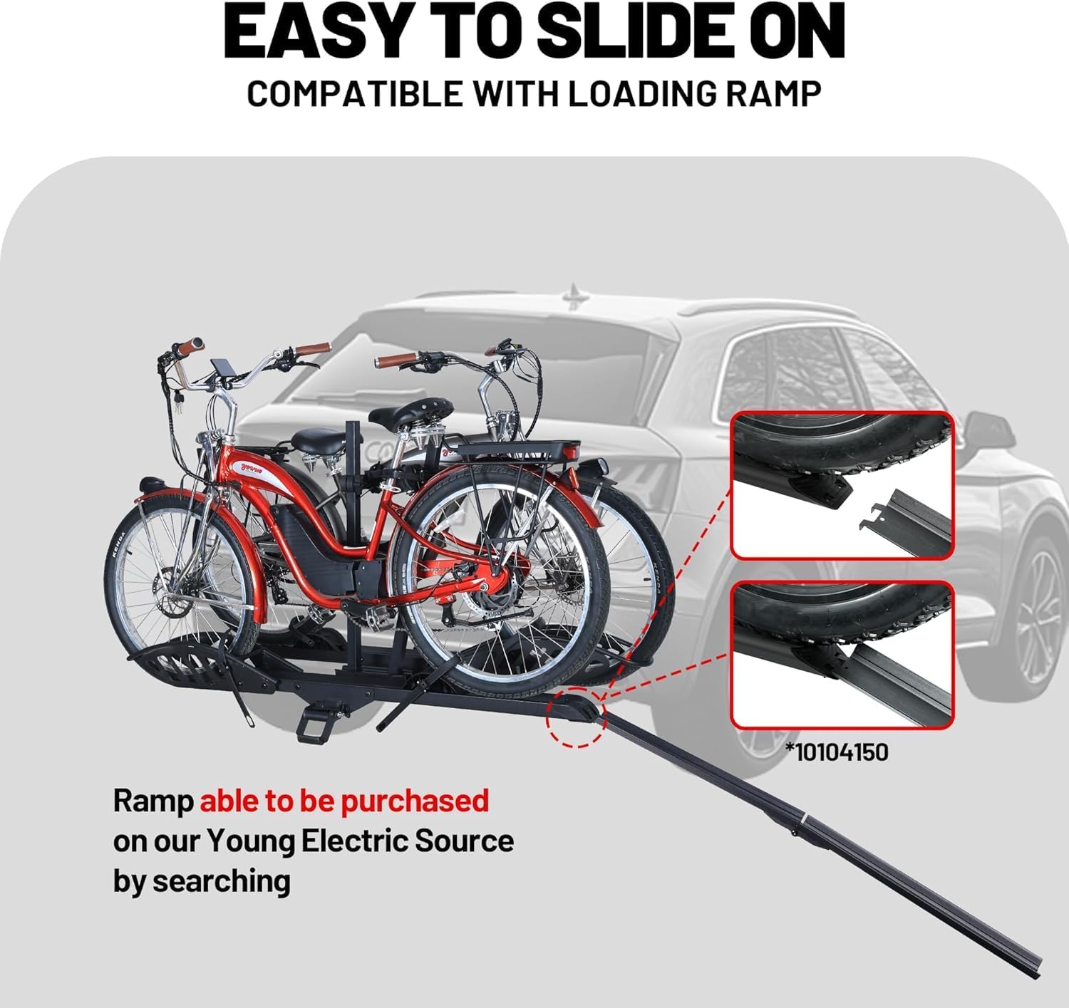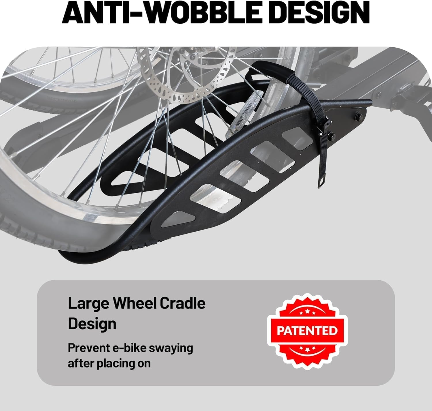 - SAFE AND SECURE ON OFFROAD: Comes with 2-arm fix, patent secure wheel cradles and anti-wobble structure, that secure your E-bikes in place without swaying and knocking against vehicle.