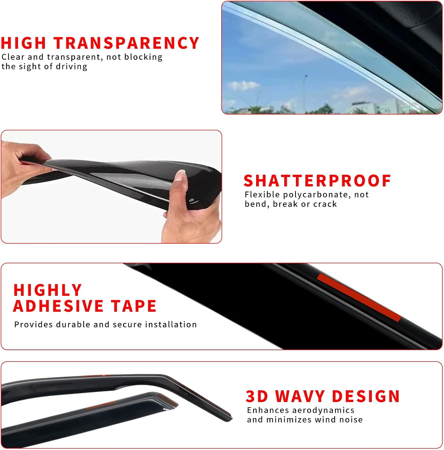- 【Improve Driving Experience】 Allows fresh air to circulate through open windows while keeping the rain out or reduces heat. Reduce mirror and window fogging; reduce sun glare through side window. Dark Smoke translucent color will not obstruct the driver's view while driving