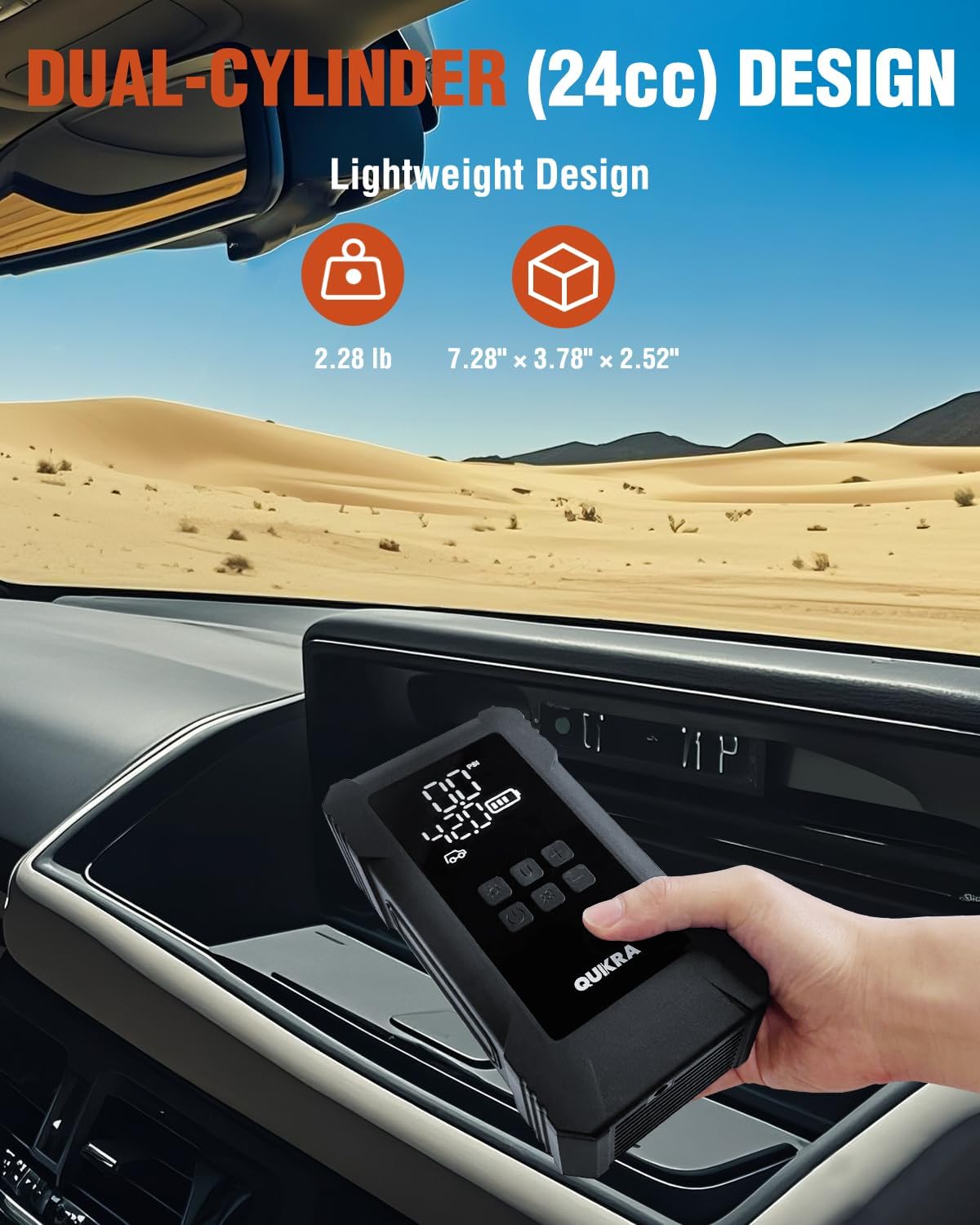 - [User-friendly Design]: This premium air pump contains multiple user-friendly designs: 4 preset modes for car, motorcycle, bike and ball, plus a custom mode up to 150PSI. Dual-line LED display, high-brightness screen remains clearly visible even in strong sunlight. Multiple measurement units, supports PSI, bar, kPa, and so on to meet global user needs. The air pump also features a built-in hidden compartment designed to store small accessories like tire valve cap and ball needle, preventing loss