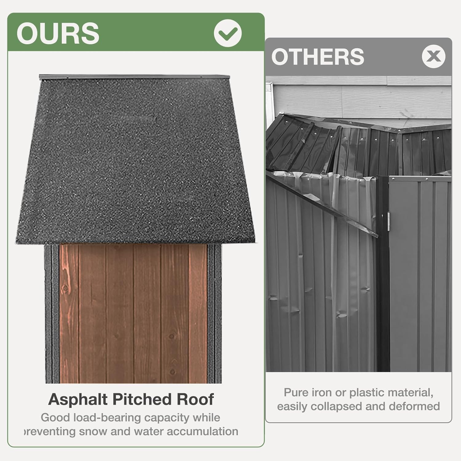 - 🛖【Waterproof Design】: This storage shed features an asphalt peaked roof that protects against rain and snow simultaneously! The raised wood floor prevents water from seeping in and ensures that the storage space is dry and safe