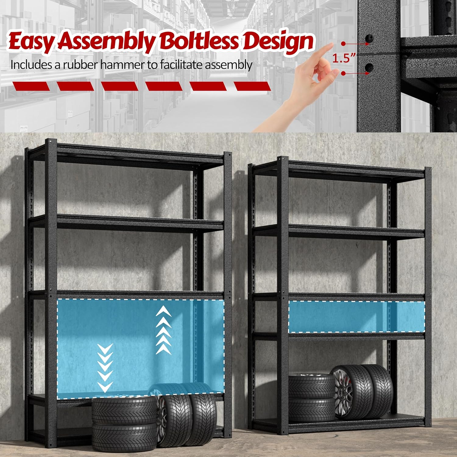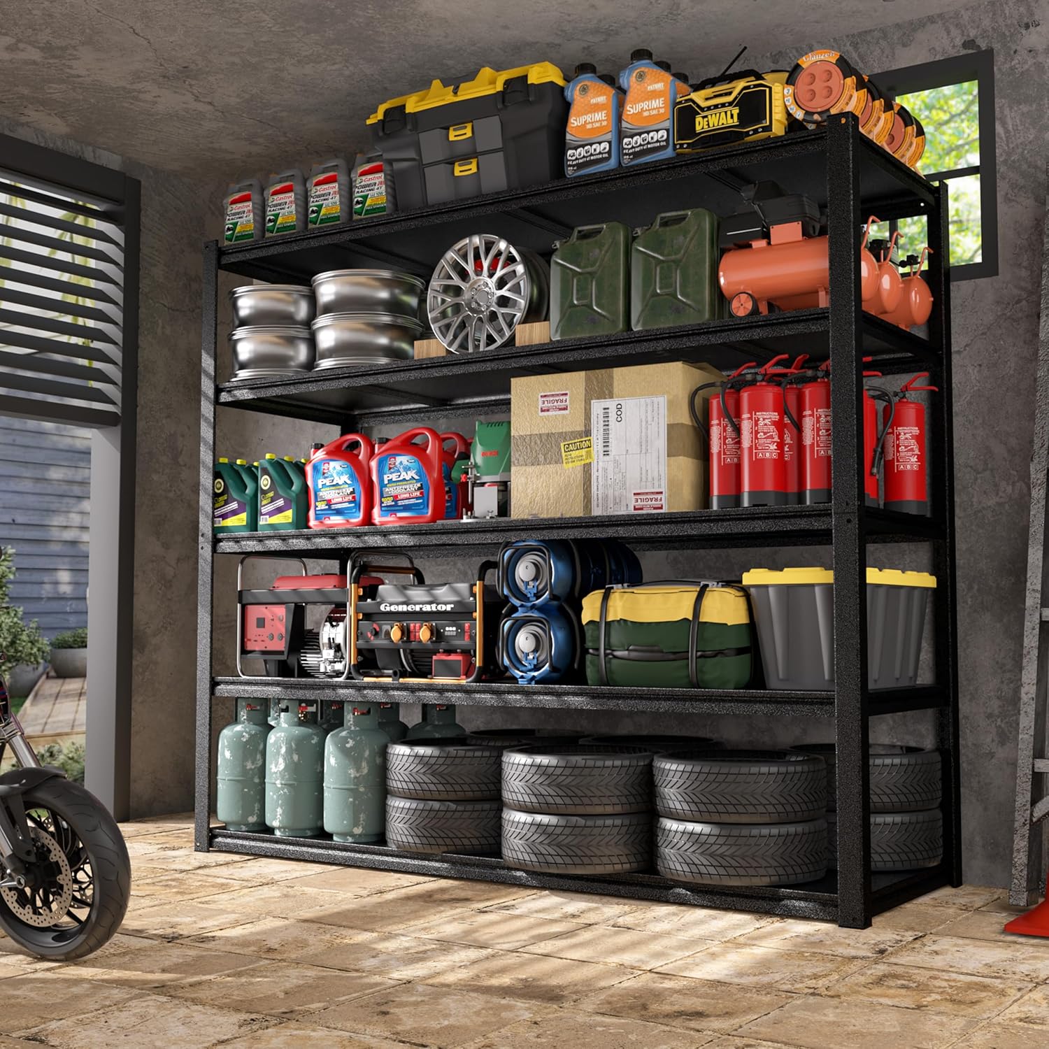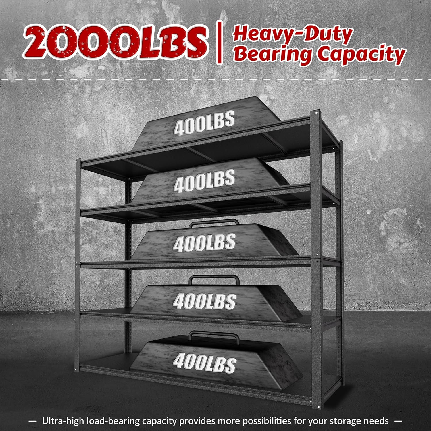 - Sturdy and Heavy Duty: 1 pack Garage shelving assembled dimension: 48" W x 18" D x 72" H, Max Load Per Shelf:600lbs, 5 tier shelves' total max load weight is 3000 lbs. Sturdy metal frame enhanced load-bearing capacity. No wobbling or shaking when fully loaded as this metal shelving has extra support beams which can enhance the stability and durability of the storage shelves.