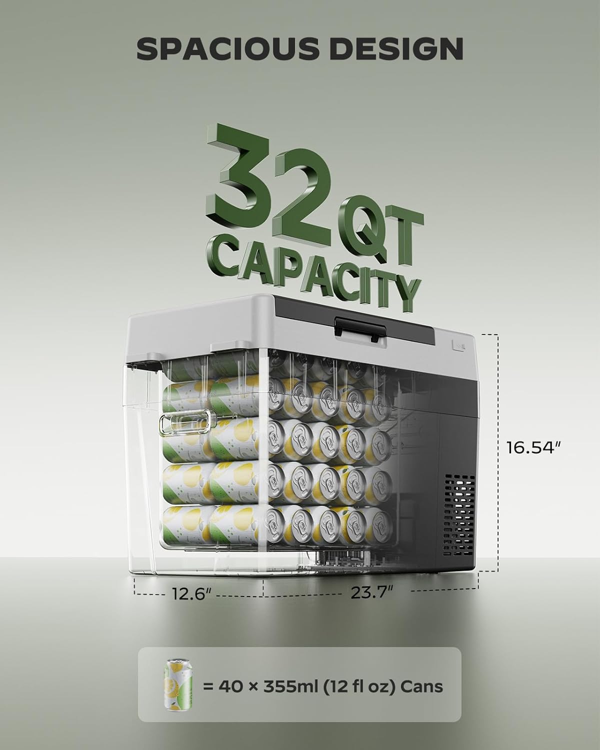 - Generous 32QT Storage Capacity: The 32QT portable freezer offers substantial space, able to hold up to 50 cans of 330ml beverages. This car fridge is designed for larger groups or extended trips, offering ample storage without compromising portability.