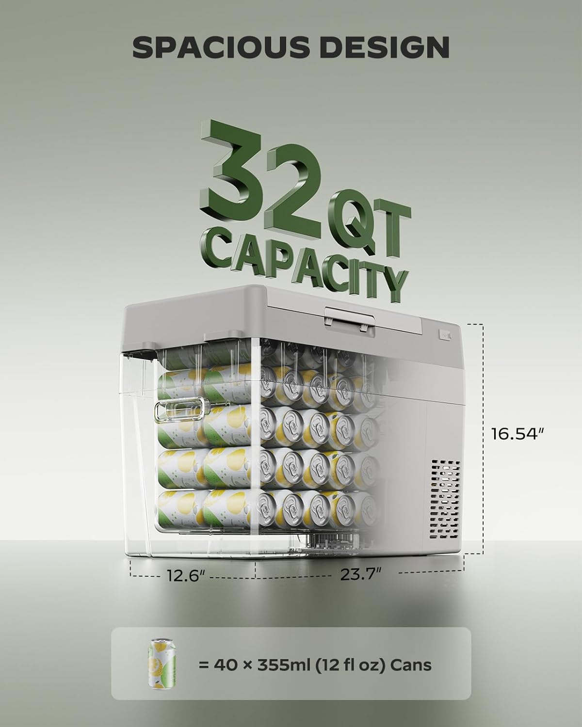 - Generous 32QT Storage Capacity: The 32QT portable freezer offers substantial space, able to hold up to 50 cans of 330ml beverages. This car fridge is designed for larger groups or extended trips, offering ample storage without compromising portability.