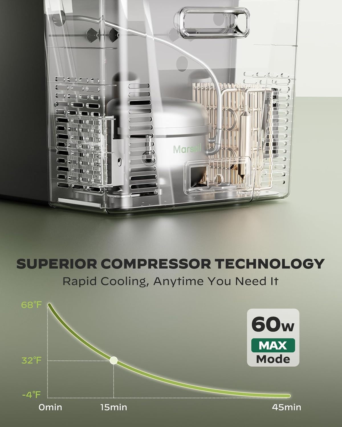 - Efficient Cooling with Compressor Technology:This car refrigerator uses advanced compressor technology to achieve fast cooling, keeping your food fresh or frozen without delay. With two cooling modes—MAX Mode (60W) for rapid cooling, it takes only 15 minutes to bring the temperature from 78°F to 32°F, and MIN Mode (45W) for long-lasting cooling with less power. Ideal for road trips, camping, and outdoor activities, this electric cooler is perfect for all your on-the-go cooling needs.