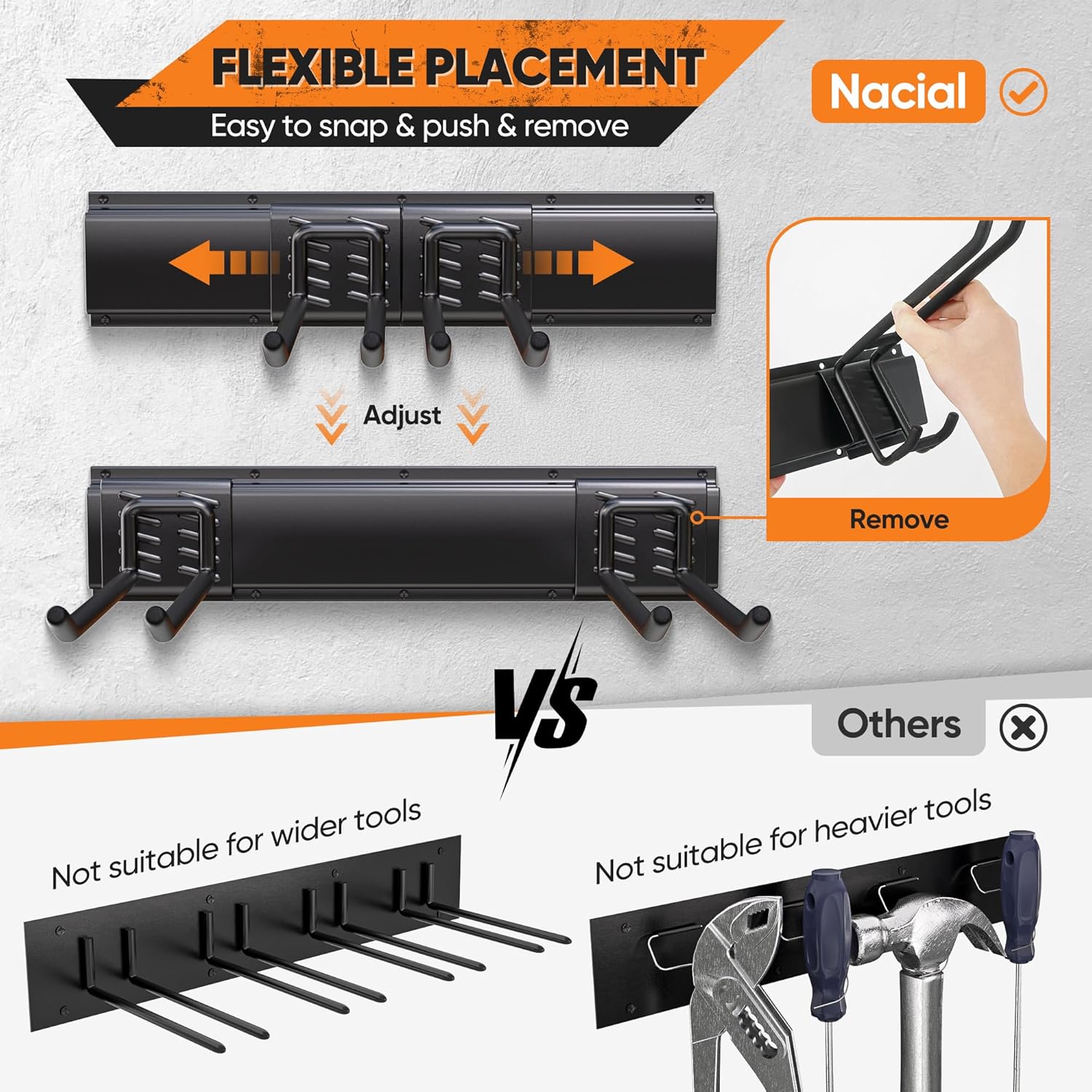 - 96-Inch Adjustable Garage Wall Tool Rack – Nacial Garage Tool Organizer Wall Mount includes 4*16" rails, 12 hooks (4*10" double-layer hooks, 4*9.4" tool hooks, 4*6.8" single hooks) and 4 storage straps. The 96-inch wall-mounted rack allows for flexible tool organization, with hooks that snap onto the rail and can be easily repositioned to accommodate tools of all sizes. Ideal for your garage, utility room, workshop, or basement. Elevate Your Organization—Get Your Nacial Garage Tool Organizer Today!