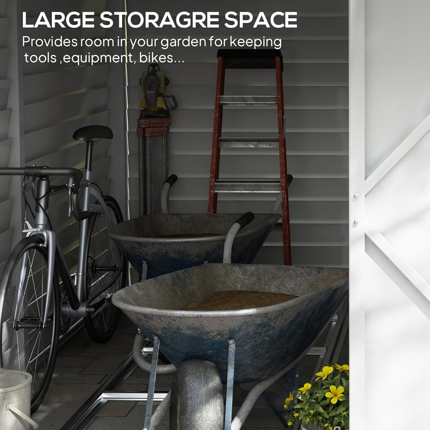 Outsunny 4.6' x 9' Steel Outdoor Storage Shed, Lean to Shed, Metal Tool House with Foundation Kit, Lockable Doors, Gloves and 2 Air Vents for Backyard, Patio, Lawn, White