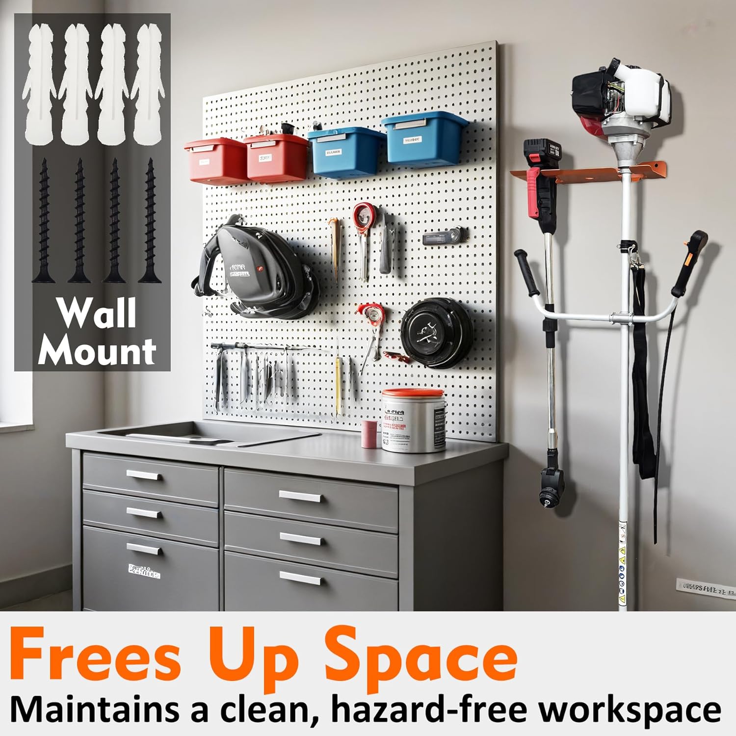 - Space-Saving Trimmer Rack: Free up floor space by mounting your tools vertically. Keeps your workspace tidy, safe, and clutter-free, ideal for organizing other activities or storing additional equipment