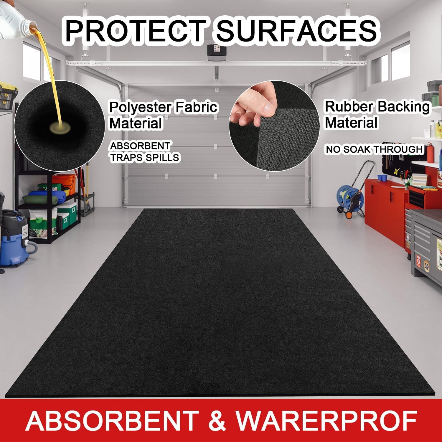 - 𝐀𝐛𝐬𝐨𝐫𝐛𝐞𝐧𝐭 & 𝐖𝐚𝐭𝐞𝐫𝐩𝐫𝐨𝐨𝐟 𝐏𝐫𝐨𝐭𝐞𝐜𝐭𝐢𝐨𝐧:This garage floor mat features a super absorbent surface that traps oil, brake fluid, and other spills, while the waterproof rubber backing prevents leaks from reaching your floor. Perfect for use as an oil spill mat for garage floor under cars, motorcycles, or trucks.