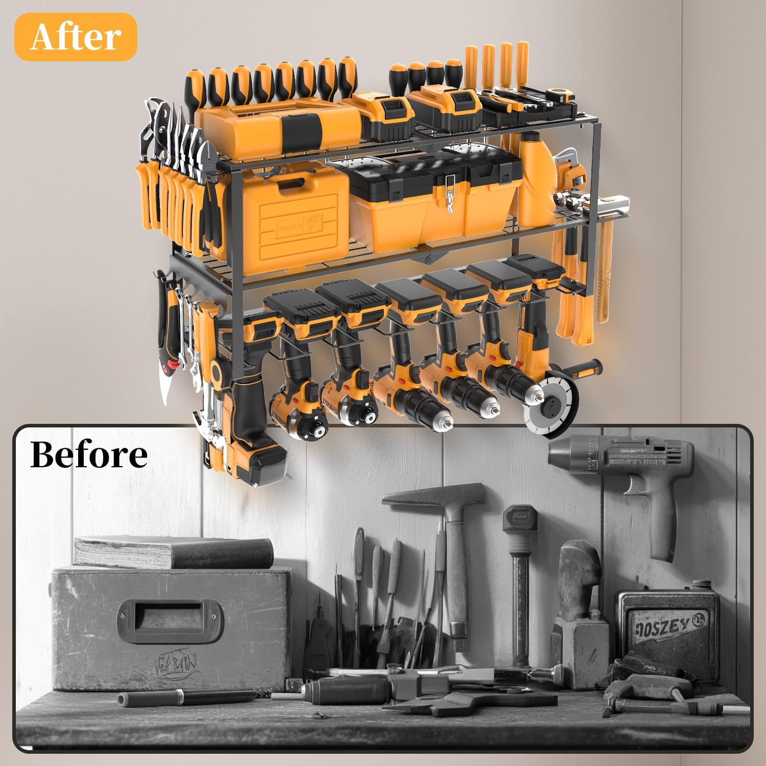 - 【Efficient Garage Organization System】 Maximize your space with a multi-tier garage organizer that holds drills, drivers, and batteries—keeping your work area neat and functional.