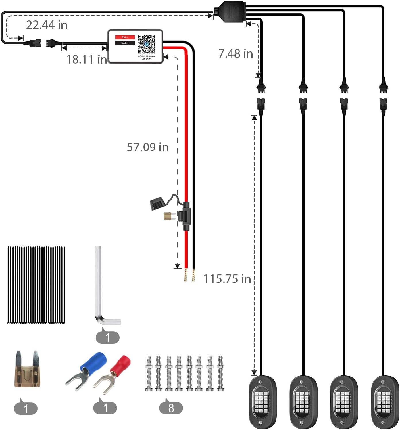 - ▶【Extra Wiring for Added Length】This RGB rock lights kits includes extra wiring length for different vehicles. The length of each pod cords is about 118 inches. If your car is large, you may need to purchase additional extension cables. Purchase Rock Light Extension Wire ASIN: B0BL72N5XW