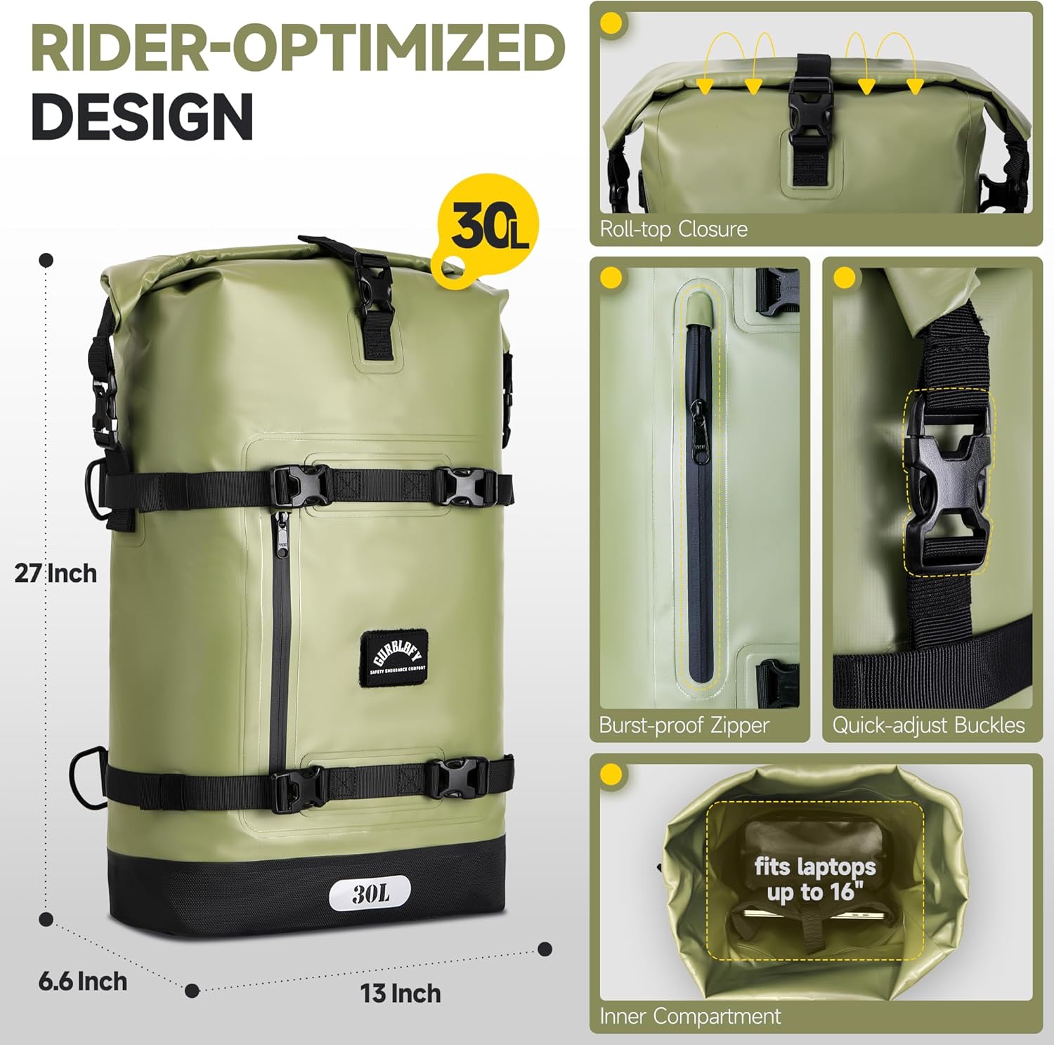 - Uniquely Engineered for Riders – Gurblofy’s Flagship Adventure Series. Engineered with heavy-duty PVC material for ultimate weather protection, this waterproof motorcycle bag combines rugged durability with sleek functionality. Available in two practical sizes - compact 15L for daily essentials or spacious 30L (13×6.6×27 inches) for extended adventures. Features three versatile color options: Classic Black, Field Green, and Stone Grey – blending durability with rugged aesthetics.