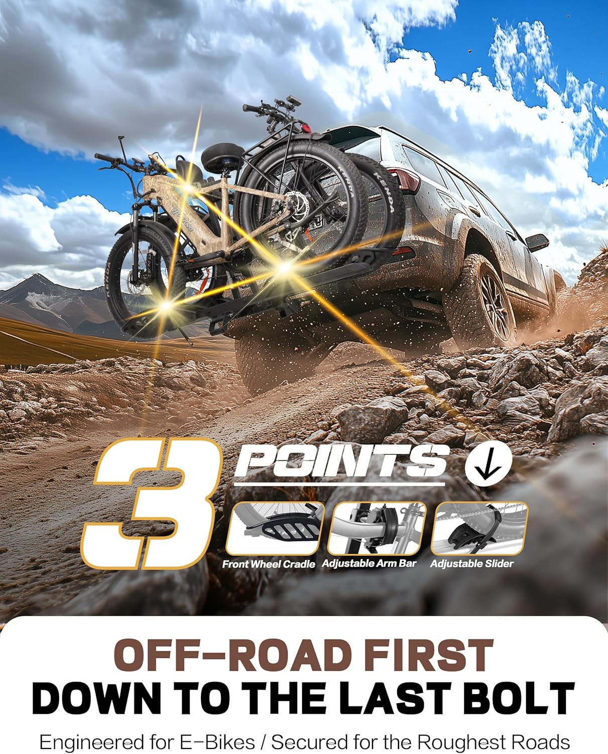 - Enhanced Compatibility & Stability: Our updated 2-inch rack now includes a V-shaped front wheel cradle, accommodating a variety of tire sizes. The vertical rod's connecting block features a semi-enclosed design. With its sturdy bolt system and shock-absorbing threads, this hitch rack ensures unparalleled stability on any terrain.