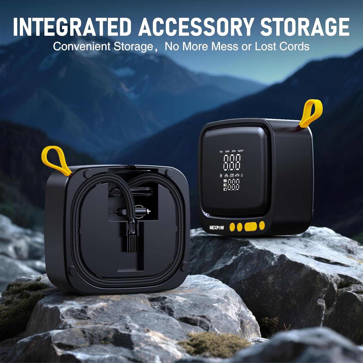 - ULTRA LONG POWER CORD AND PORTABLE STORAGE: This car tire pump is equipped with a 0.5m long (1.6ft) air hose and a 3m long (9.8ft) power cord, making it easy to connect to any tire. The integrated storage box on the back facilitates the storage of accessories, making the tire pump more portable. This convenient design brings a relaxed and convenient inflation experience.