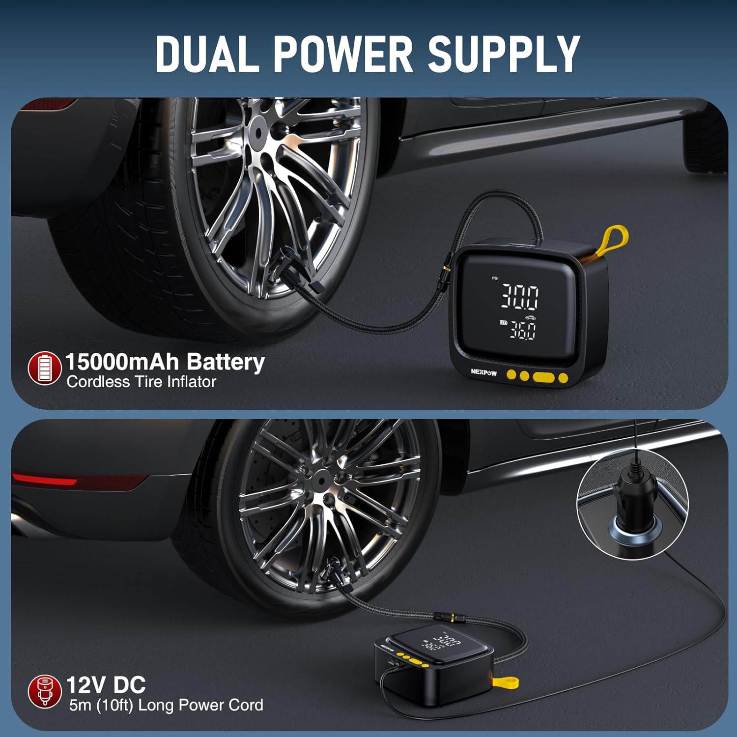 - DUAL POWER MODES AND AUTO SHUT-OFF: This car tire air pump is equipped with a 15000mAh rechargeable battery and features a wireless design for easy inflation, bringing flexible portability to your journey. At the same time, it is equipped with a 12V DC adapter as a backup power source, so you don't have to worry about the battery running out during the journey. In addition, the tire inflator also has an automatic shut-off function. After reaching the preset pressure value, the tire inflator will stop working.