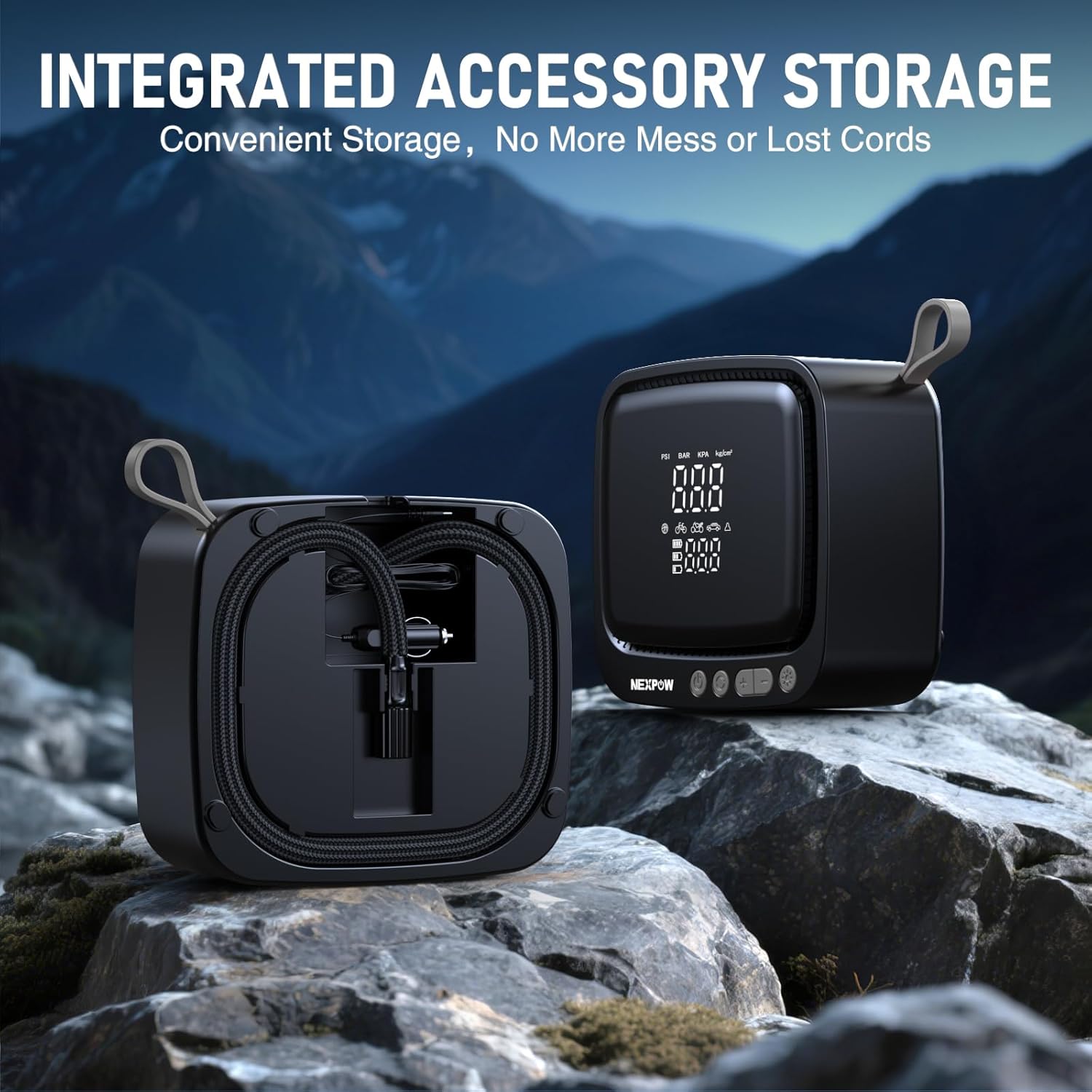 - ULTRA LONG POWER CORD AND PORTABLE STORAGE: This car tire pump is equipped with a 0.5m long (1.6ft) air hose and a 3m long (9.8ft) power cord, making it easy to connect to any tire. The integrated storage box on the back facilitates the storage of accessories, making the tire pump more portable. This convenient design brings a relaxed and convenient inflation experience.