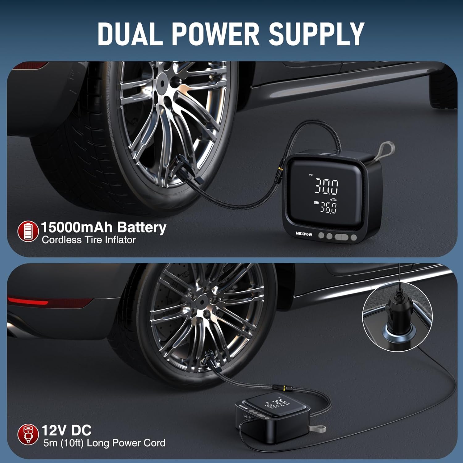 - DUAL POWER MODES AND AUTO SHUT-OFF: This car tire air pump is equipped with a 15000mAh rechargeable battery and features a wireless design for easy inflation, bringing flexible portability to your journey. At the same time, it is equipped with a 12V DC adapter as a backup power source, so you don't have to worry about the battery running out during the journey. In addition, the tire inflator also has an automatic shut-off function. After reaching the preset pressure value, the tire inflator will stop working.