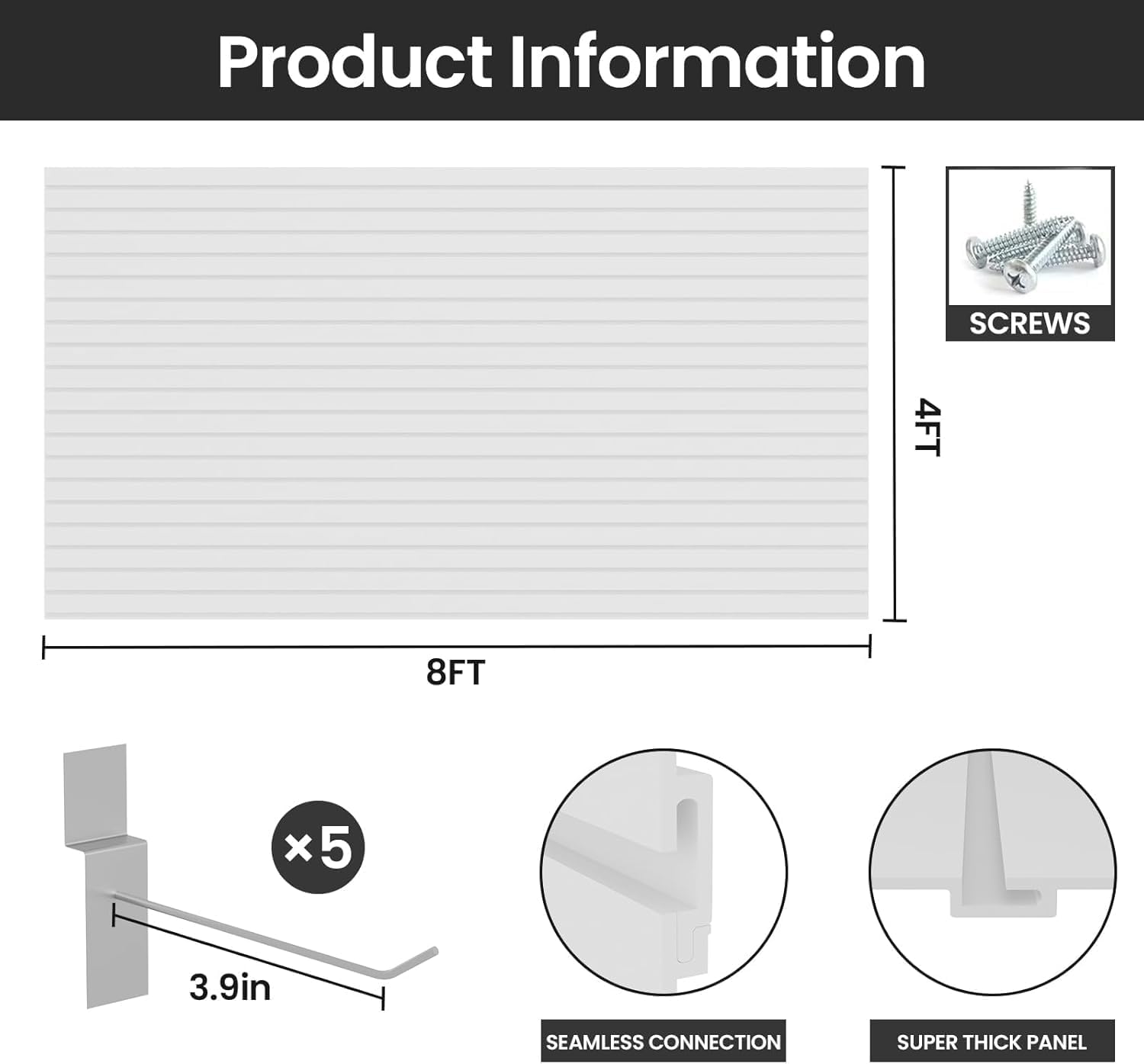 Slatwall Panel Wall Storage Systems, 4x8 ft Slat Wall Paneling Garage Wall Organizer with Five Hooks, Heavy Duty Wall Mounted PVC Wall Rack, White