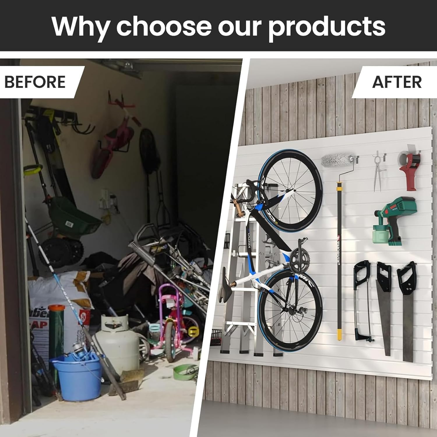 - Maximize Your Space: Unlock the full potential of your garage with our wall organizer system, designed to optimize vertical space. Transform your cluttered garage into a well-organized and efficient area. Say goodbye to mess and hello to a fully optimized space where your tools, equipment, and accessories are easily accessible, creating a visually appealing environment.