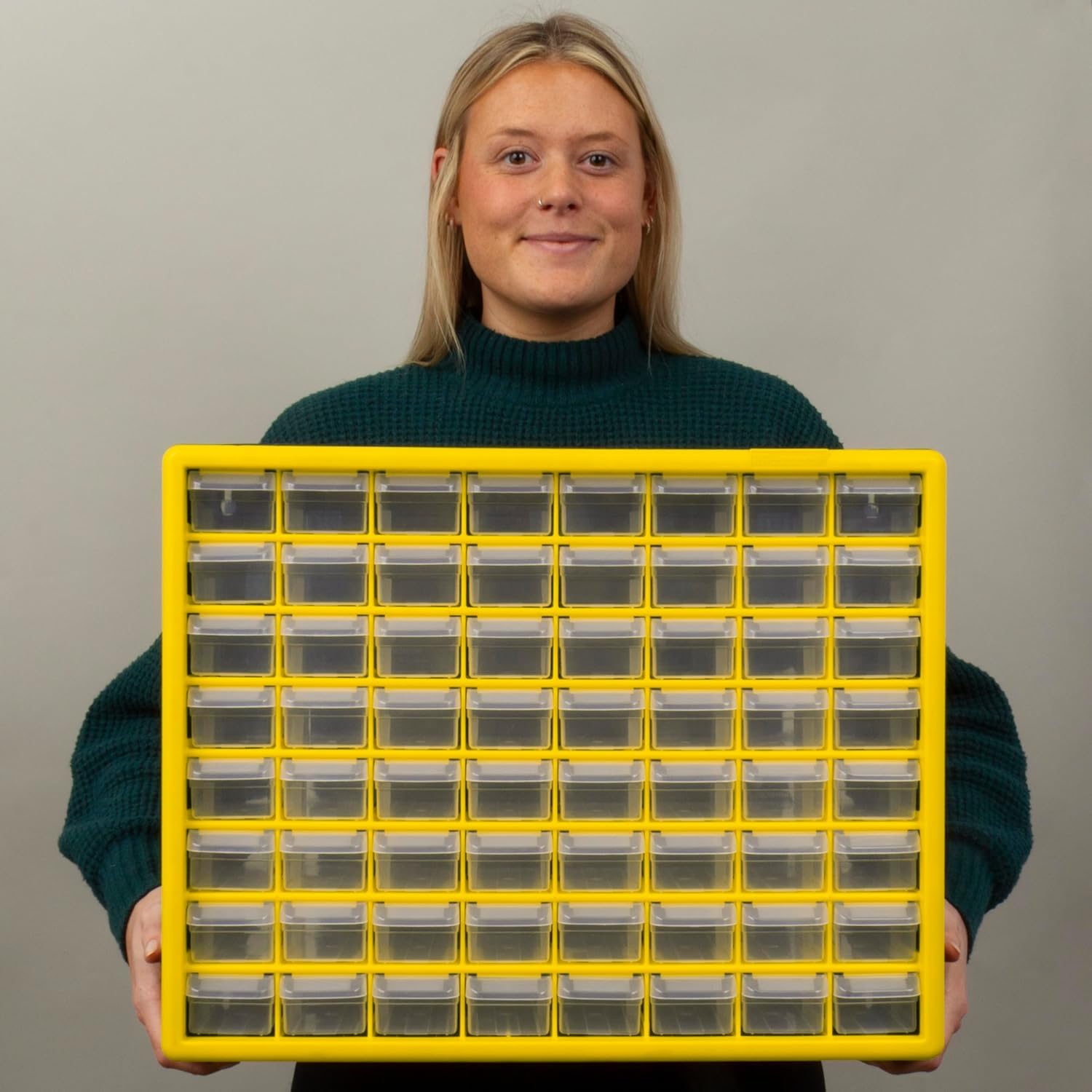 Akro-Mils 64-Drawer Plastic Drawer Storage Cabinet for Garage Organization, Bead Organizer, Building Bricks Storage, Teacher Toolbox, Makeup Organizer, 20-Inch W x 6-Inch D x 16-Inch H, 10164 Yellow