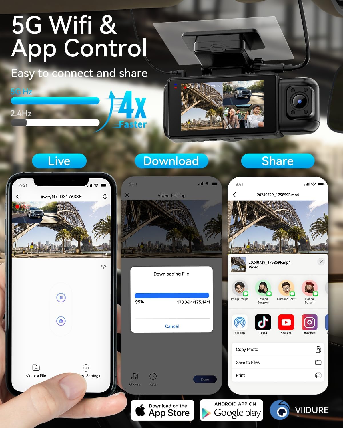 - 【5G WiFi & Easy Phone Connection】Enjoy high-speed 5G WiFi for ultra-fast downloads, reaching speeds up to 8MB/s (compared to just 2MB/s with 2.4GHz WiFi). Stream live video from your dash camera for cars seamlessly on your phone, adjust camera settings, download footage, and share videos effortlessly on platforms like Instagram, YouTube, and Facebook. You can use the app free and not recomment to pay the subscription fee.
