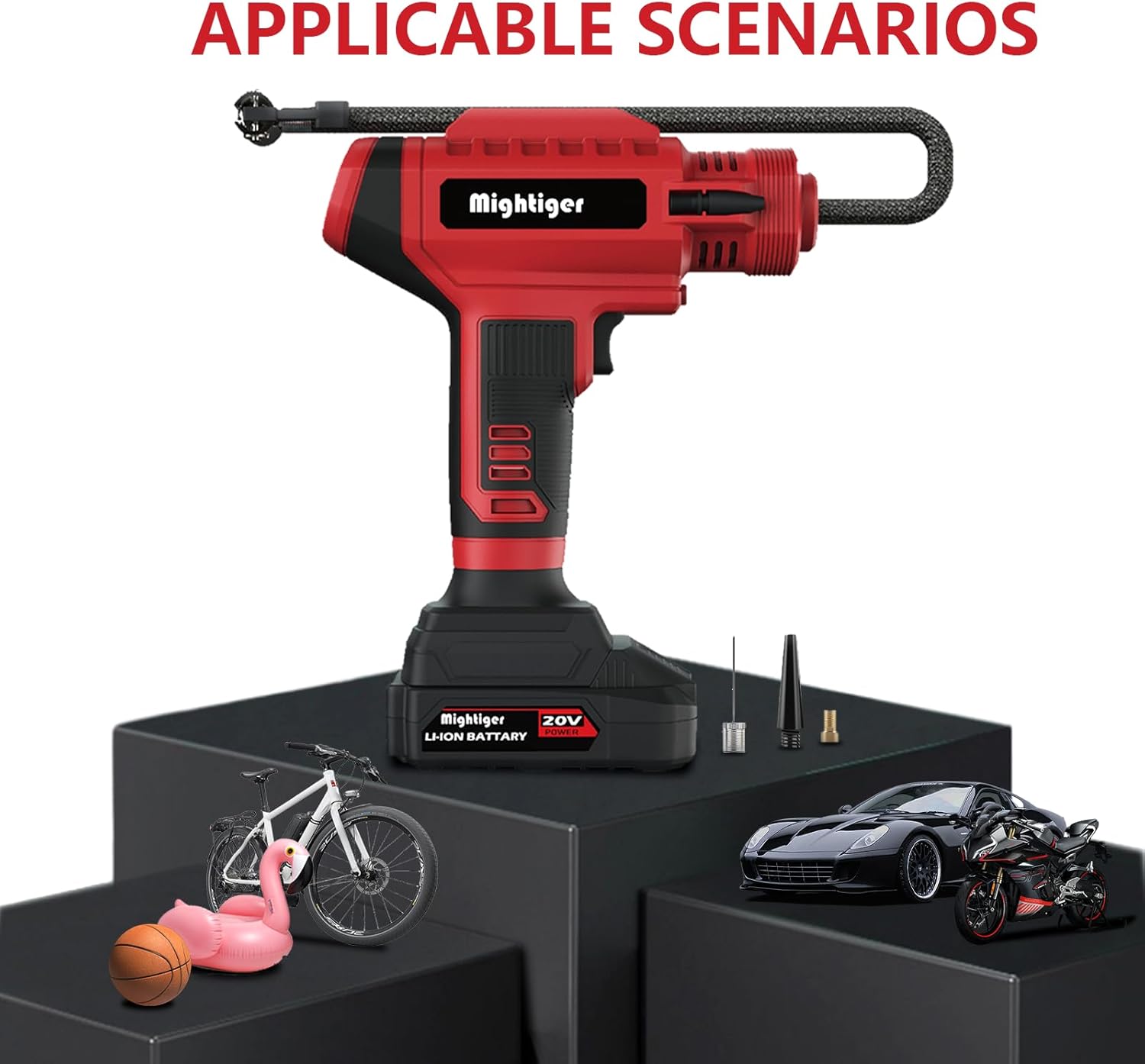 - Dual Power Supply: Never run out of power! This portable air compressor works with both a 20V detachable Li-ion battery and 12V car adapter – perfect for road trips and emergencies.